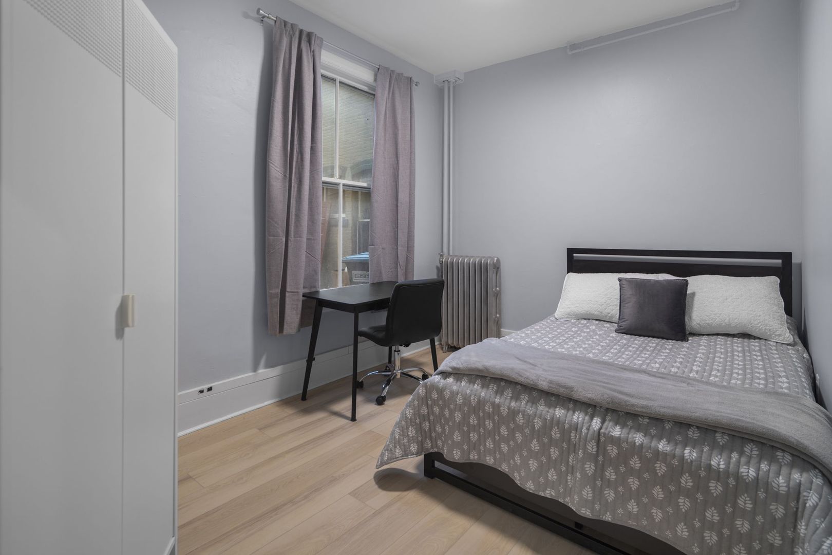 Each bedroom features a full-size bed frame and mattress, desks and desk chair, and dresser or armoire.