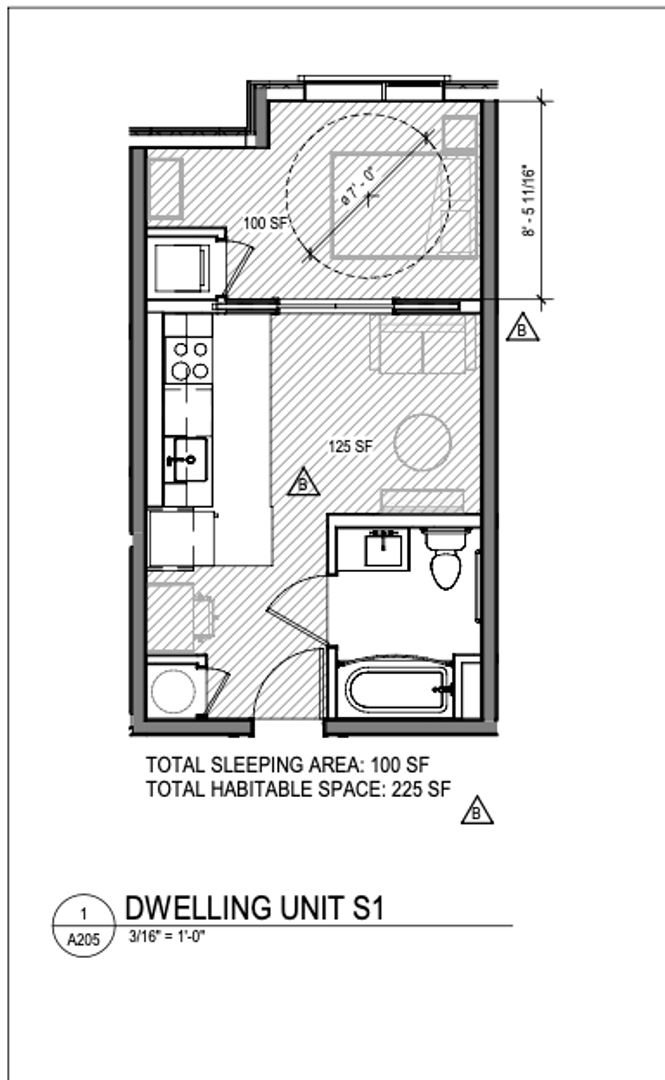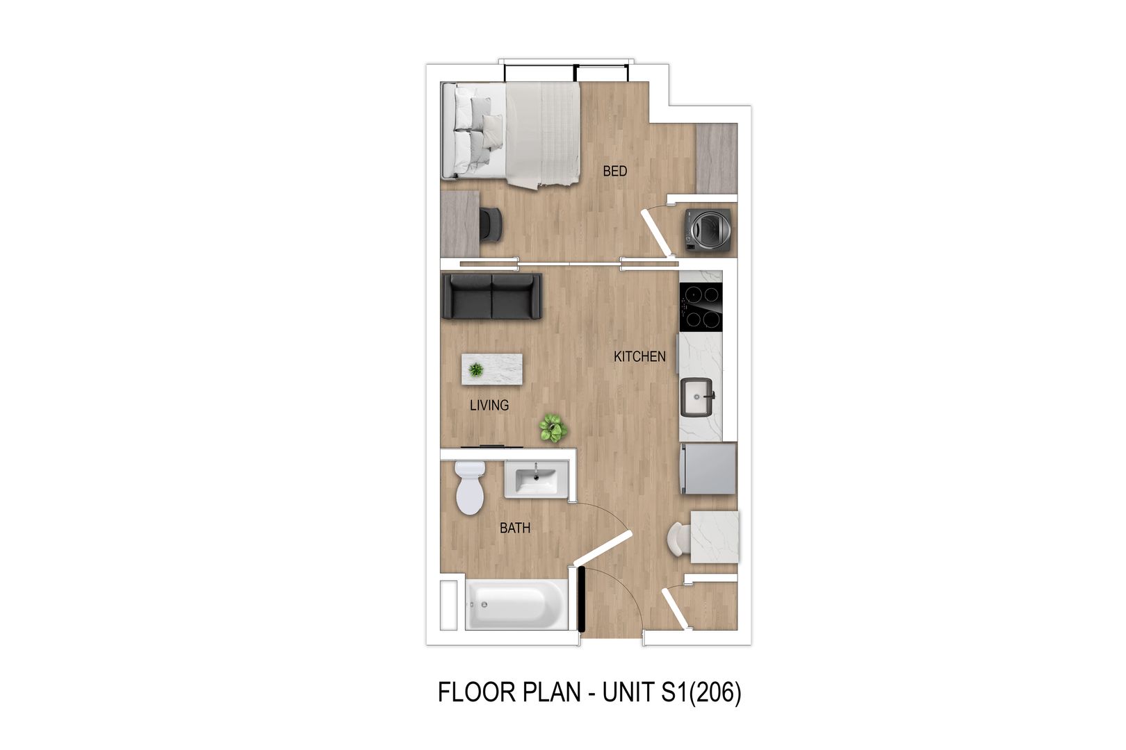 These final S1 units feature an open layout similar to a studio, but with a sliding door to close off the bedroom for privacy.