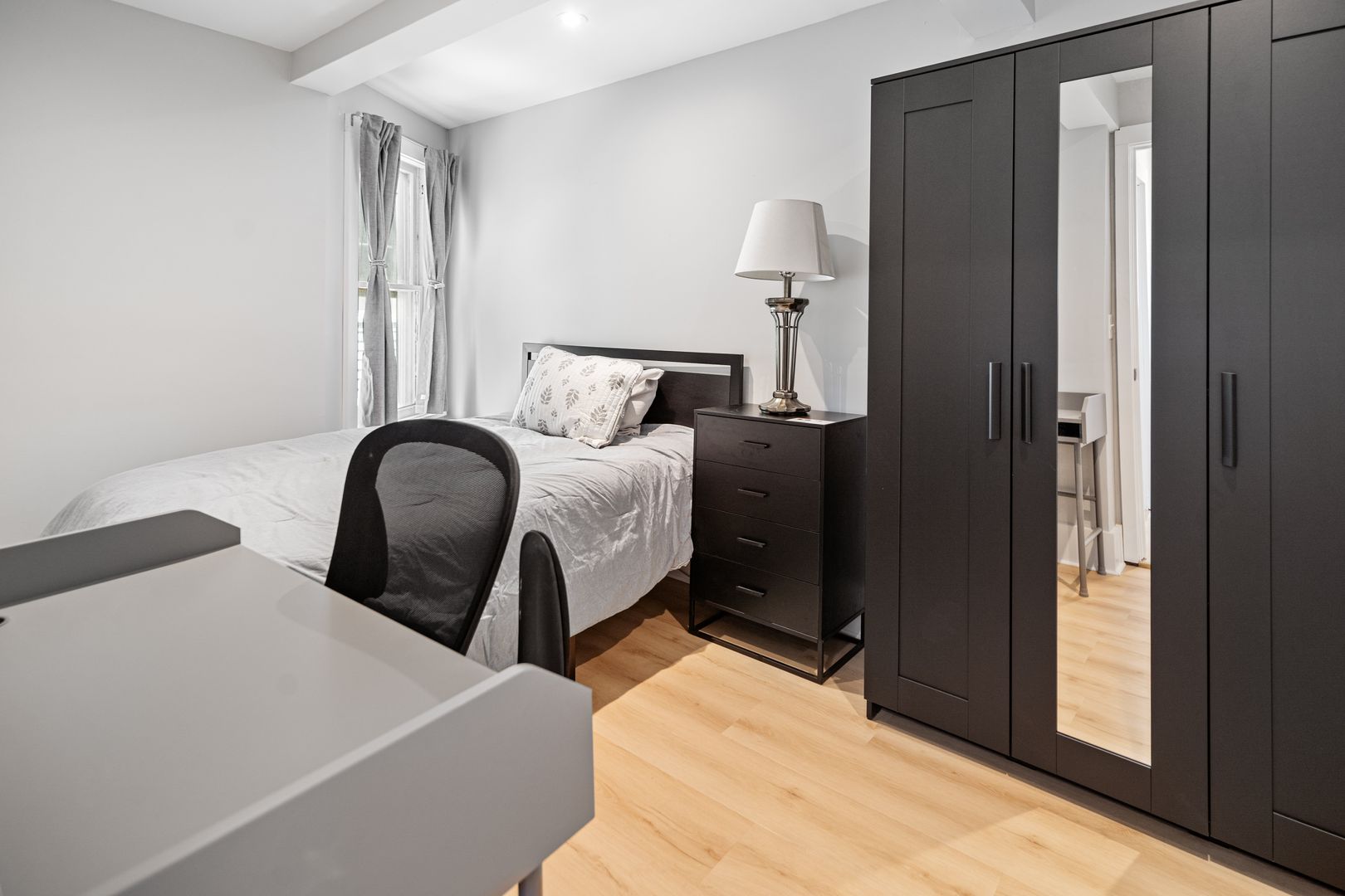 • Bedroom furnished with a full-size bed and mattress, desk and chair, dresser, and closet space