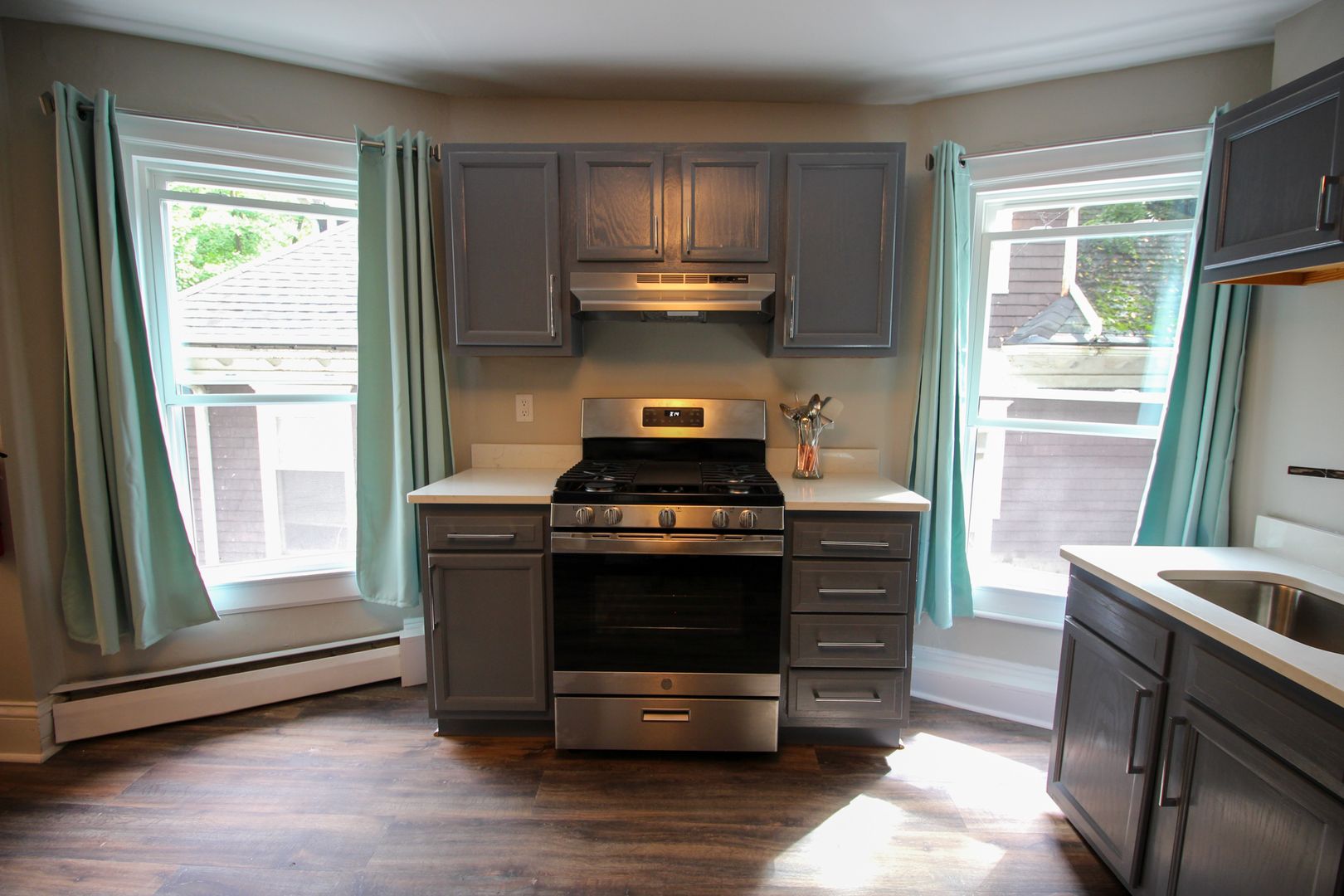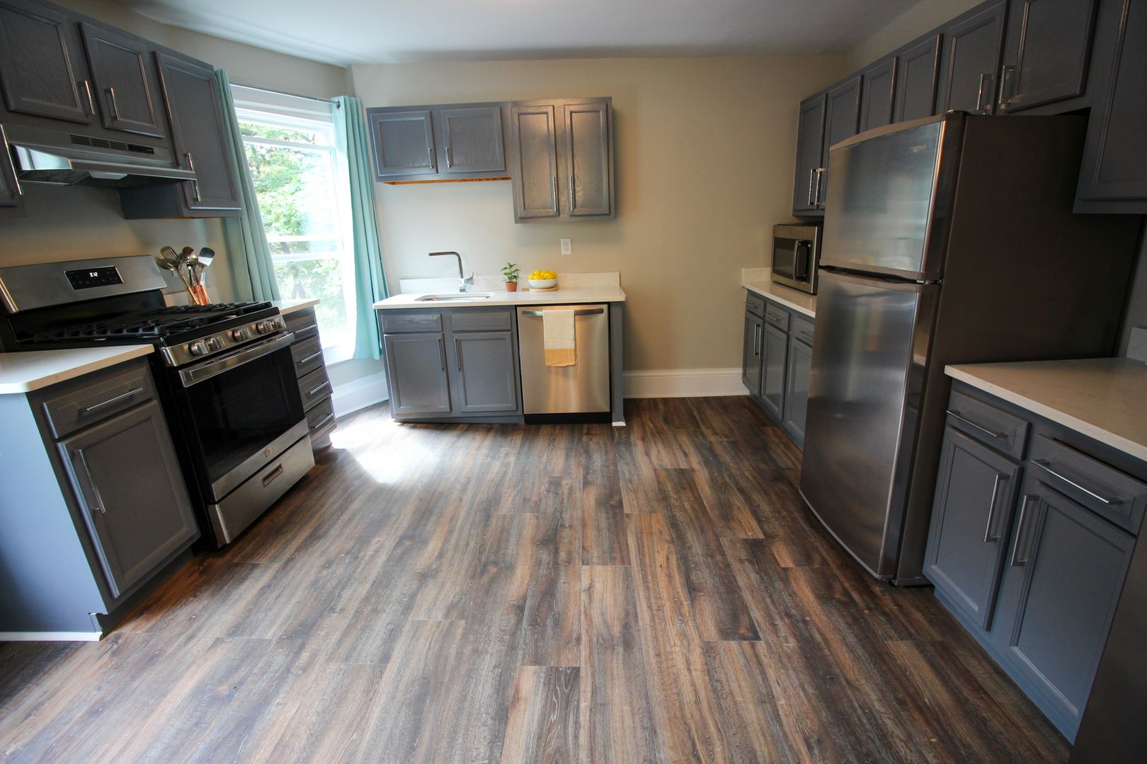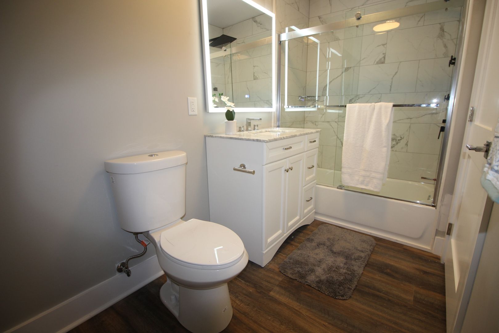 This apartment was extensively renovated and features all new flooring, doors, drywall, and contemporary finishes. Enjoy this home's classic charm with modern amenities like in-unit laundry and stylish new lighting fixtures. The updated kitchen boasts quartz countertops and new stainless steel appliances, and the bathrooms feature custom tiled showers, new vanities, and updated light fixtures.