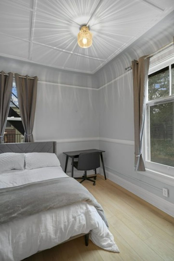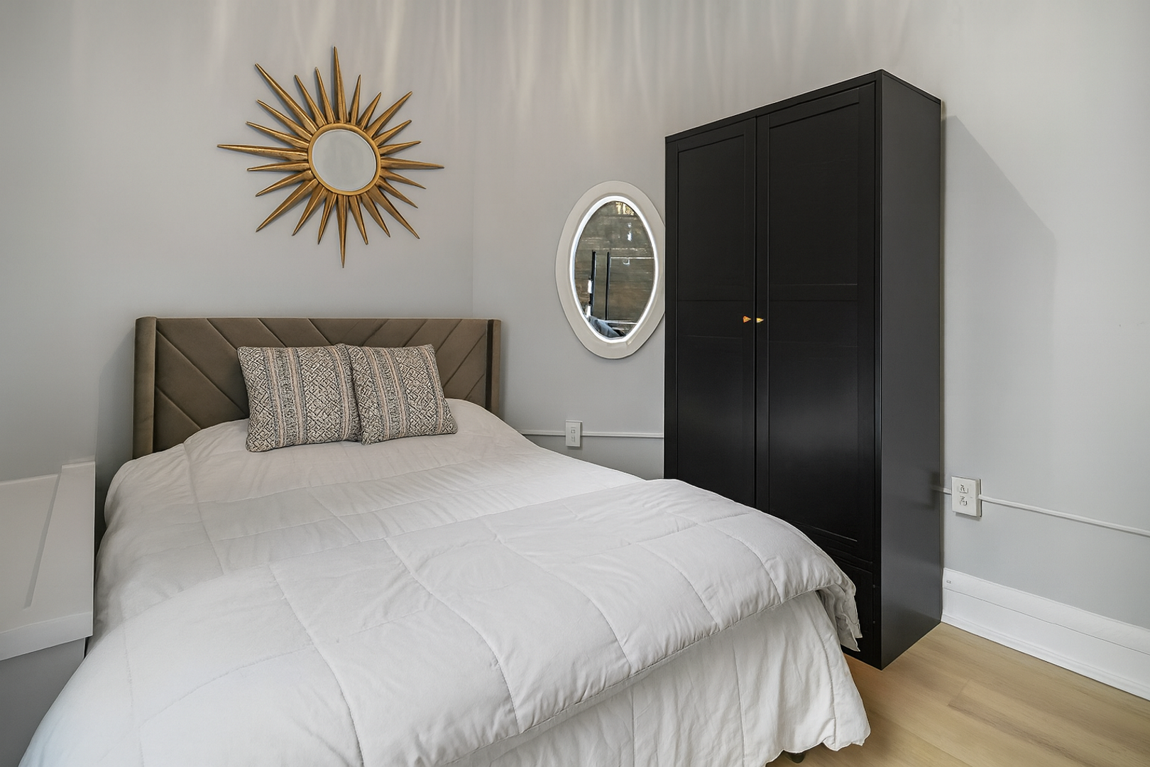Each bedroom is furnished with a full-size bed and mattress, desk and chair, and ample storage through either a closet, dresser, or large armoire.