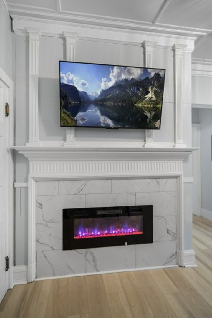 Inside, you’ll find new wood-style vinyl flooring, custom tile shower, and LED vanity mirrors that add both function and flair. The kitchen is a true highlight, featuring stainless steel appliances, quartz countertops, and rich wood cabinetry for a sleek and durable finish. Space here for cooking, dining, and entertaining, with new furniture that includes a dining table with chairs, a comfortable sofa, and a wall-mounted flat-screen TV.