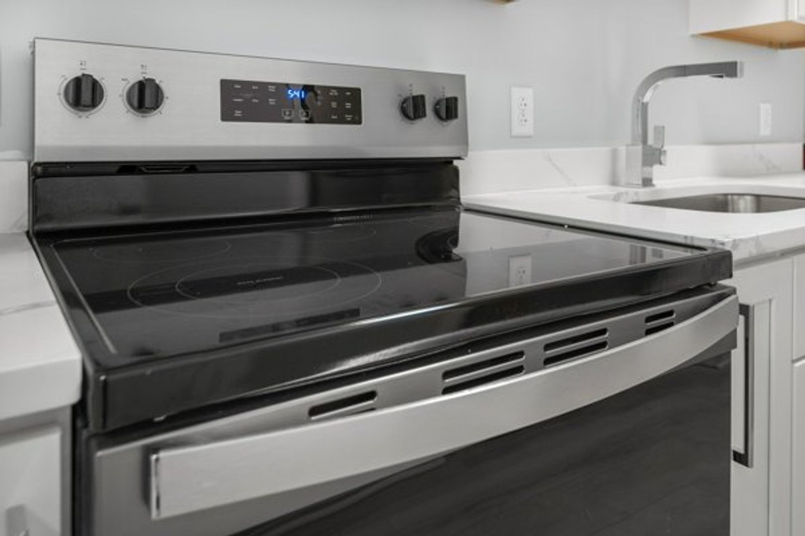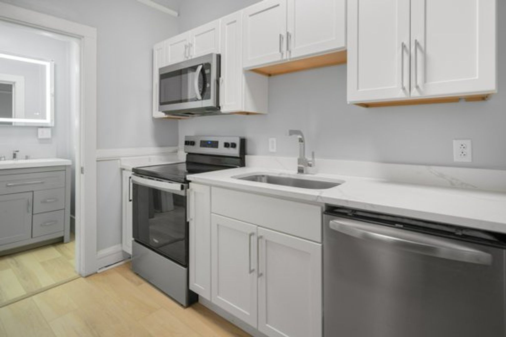 • Renovated kitchen with stainless steel appliances, quartz countertops, and wood cabinetry