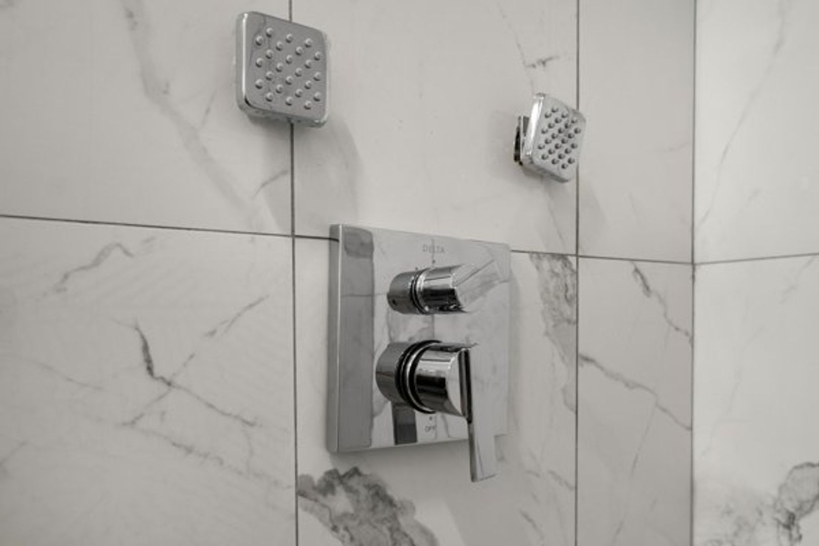 • Custom tiled bathroom with LED vanity mirror and body sprayer shower