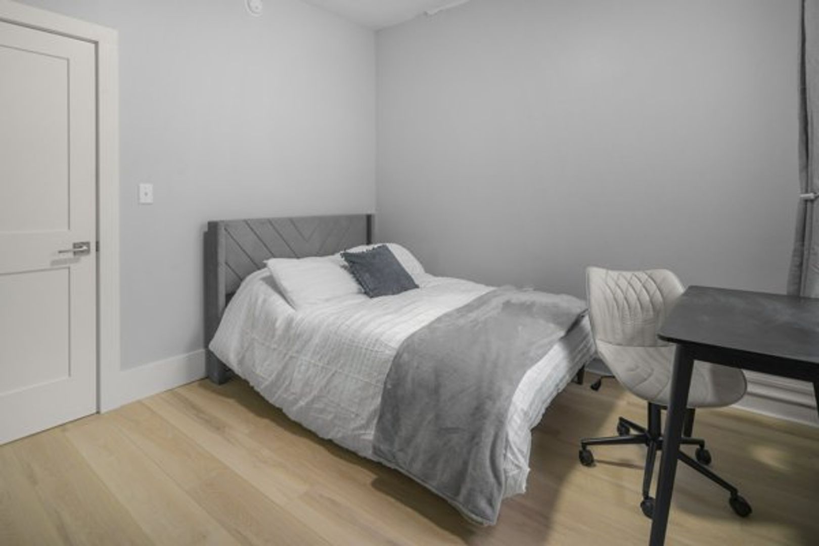 Each bedroom features a full-size bed frame and mattress, desks and desk chair, and dresser or armoire.
