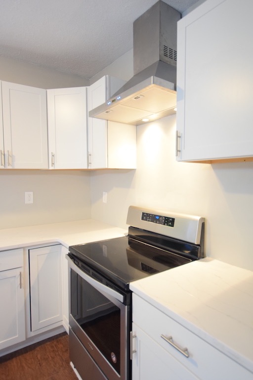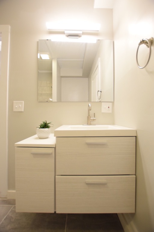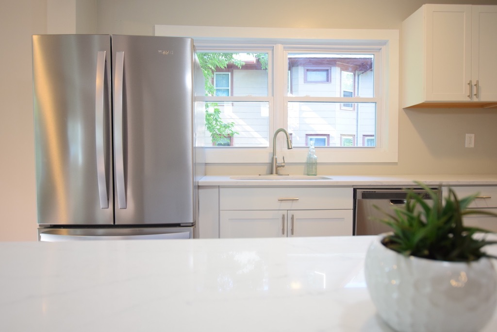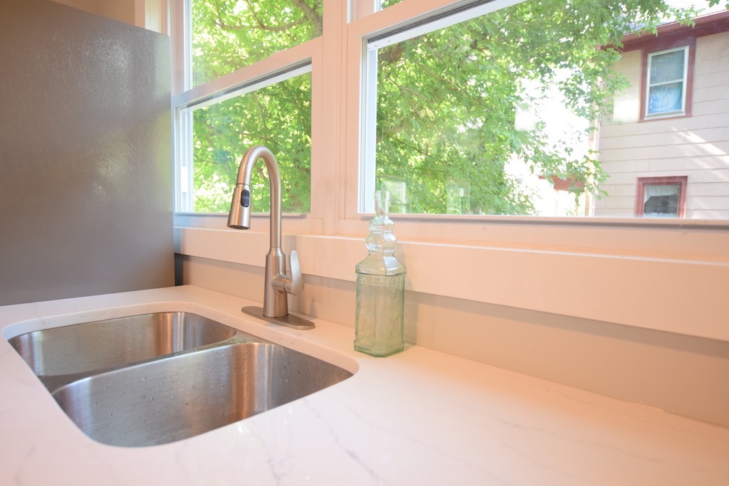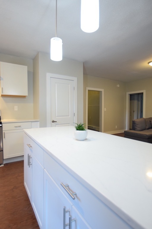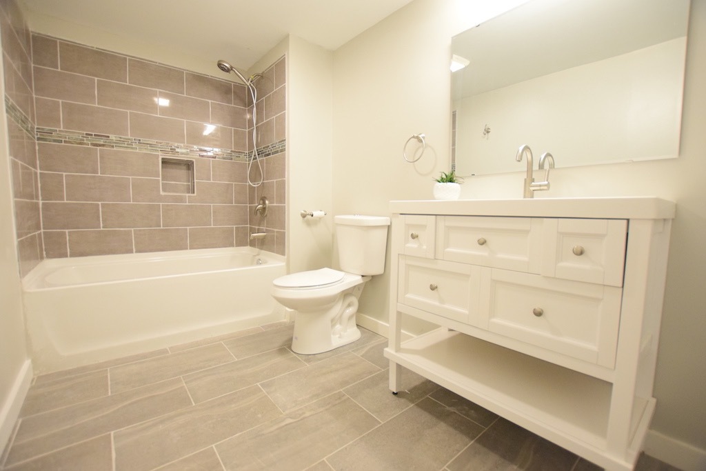 This first floor apartment contains a very spacious eat-in kitchen with an island and bar seating that opens up into a separate dining and living room. There is white quartz counters, stainless steel appliances, modern lighting and a large walk in pantry. There are three bedrooms and two baths. The master bedroom contains a walk in closet and bathroom connected. The master bathroom has a shower stall, the second bathroom contains a tub. The other two bedrooms each have two large closets.