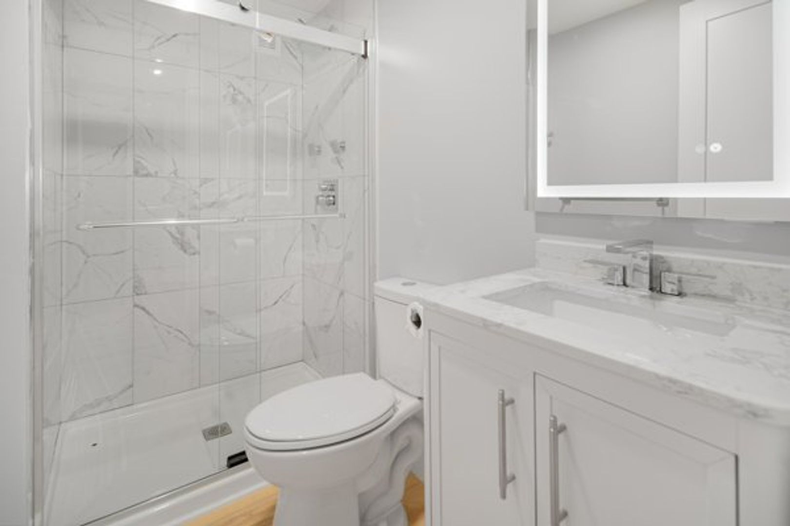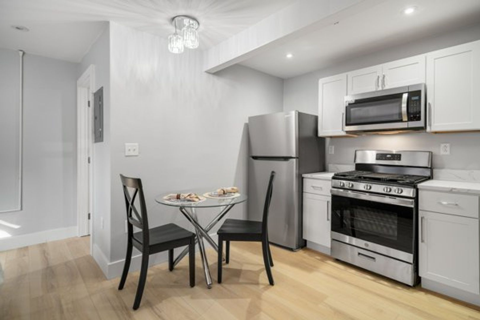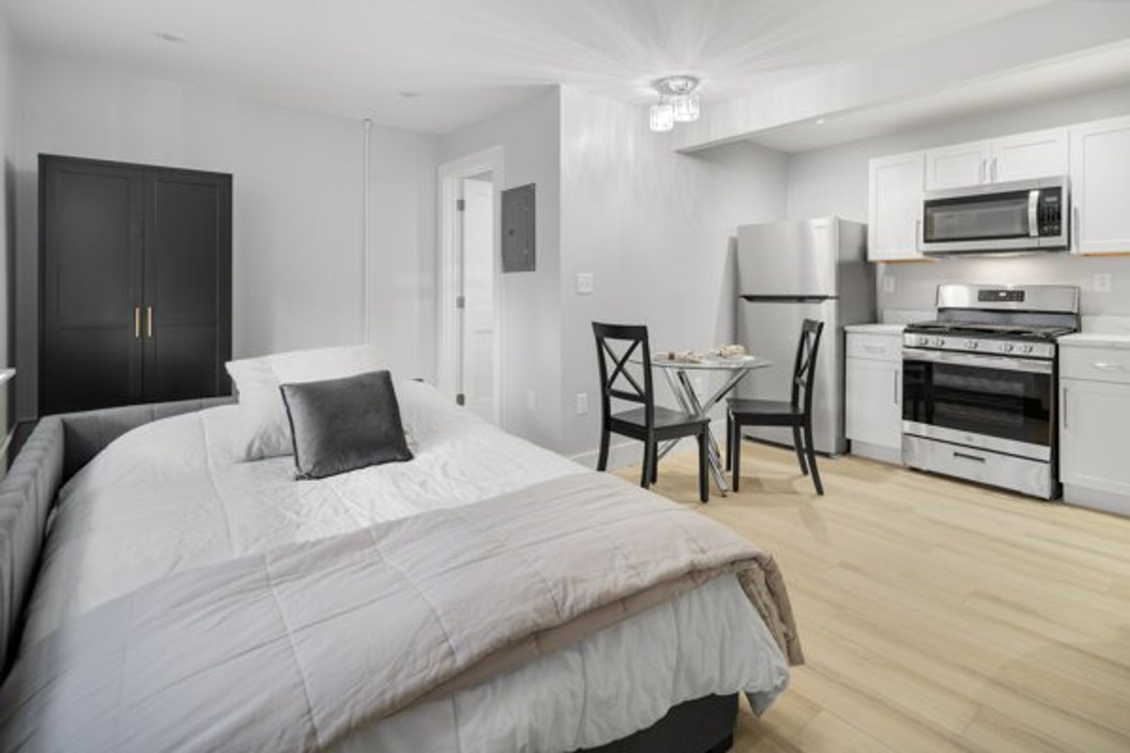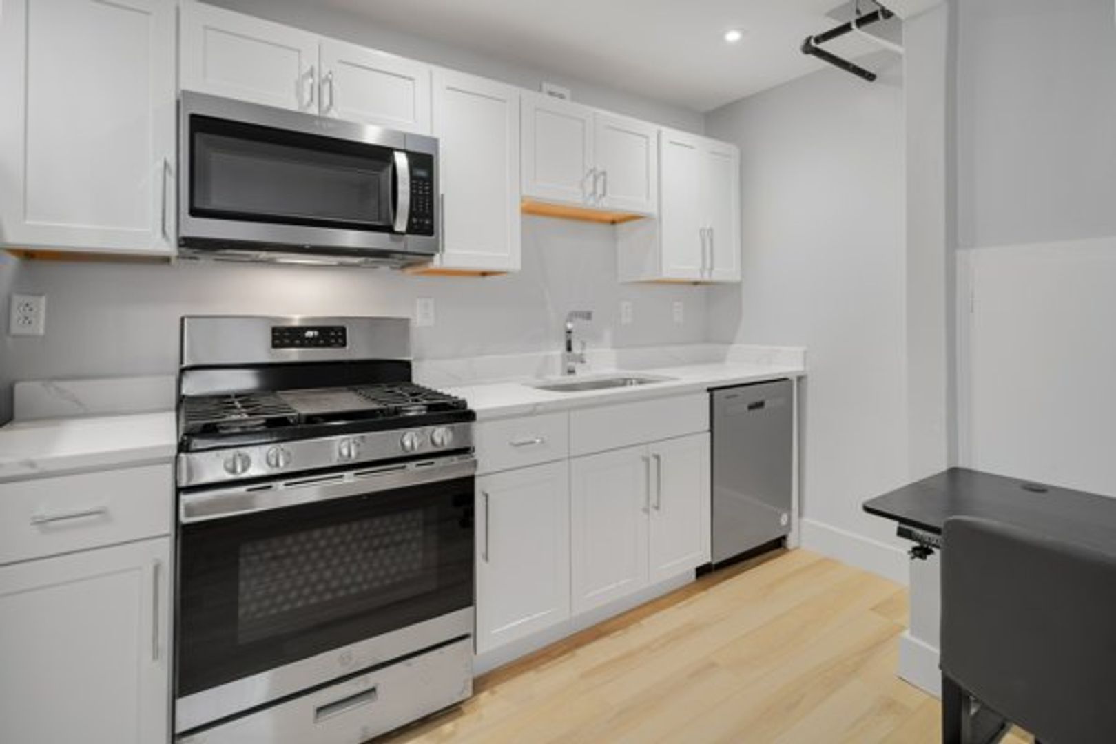 The kitchen features a full suite of new stainless steel appliances, wood cabinets, and quartz countertops.