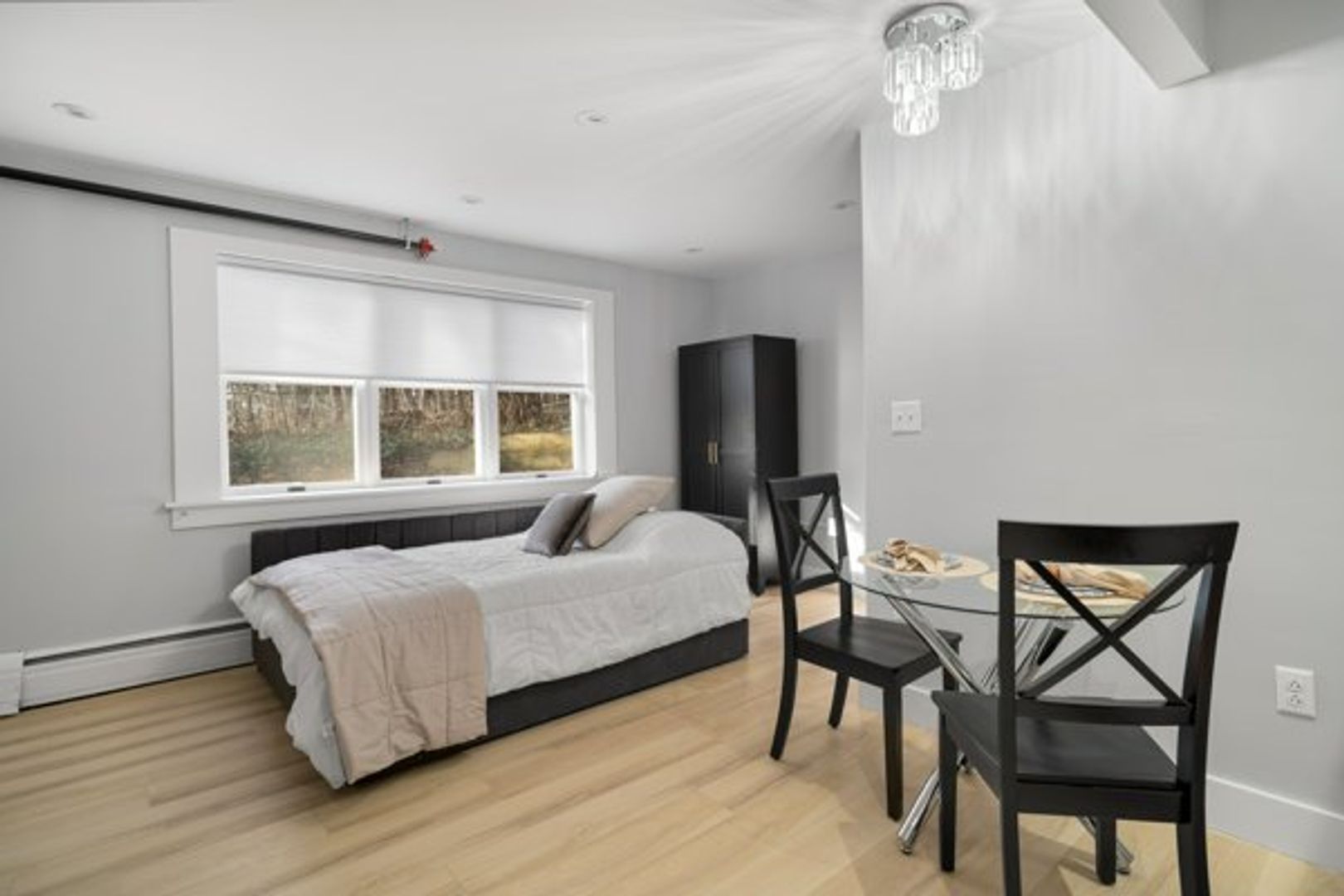 Common area has new furnishings including wall-mounted flat screen TVs and space for living and dining accordingly. Also includes a couch, dining room table and chairs, full size bed frame and mattress, desk with chair and armoire.