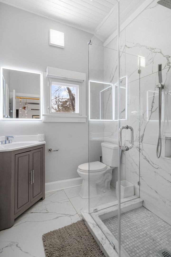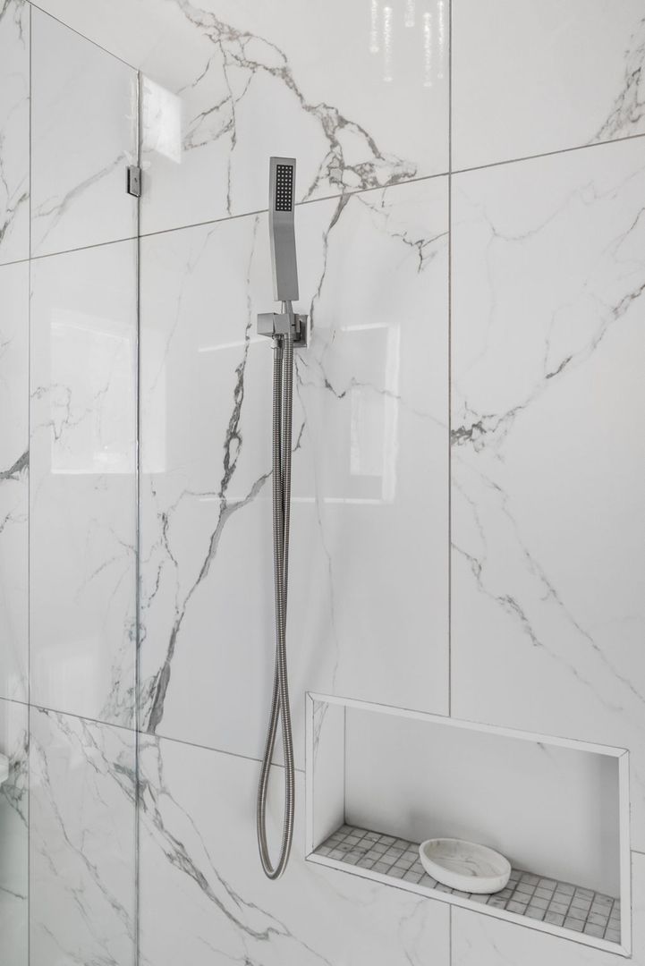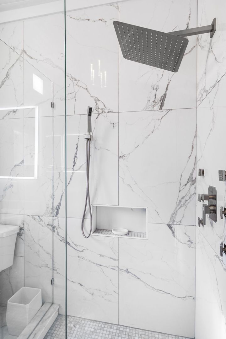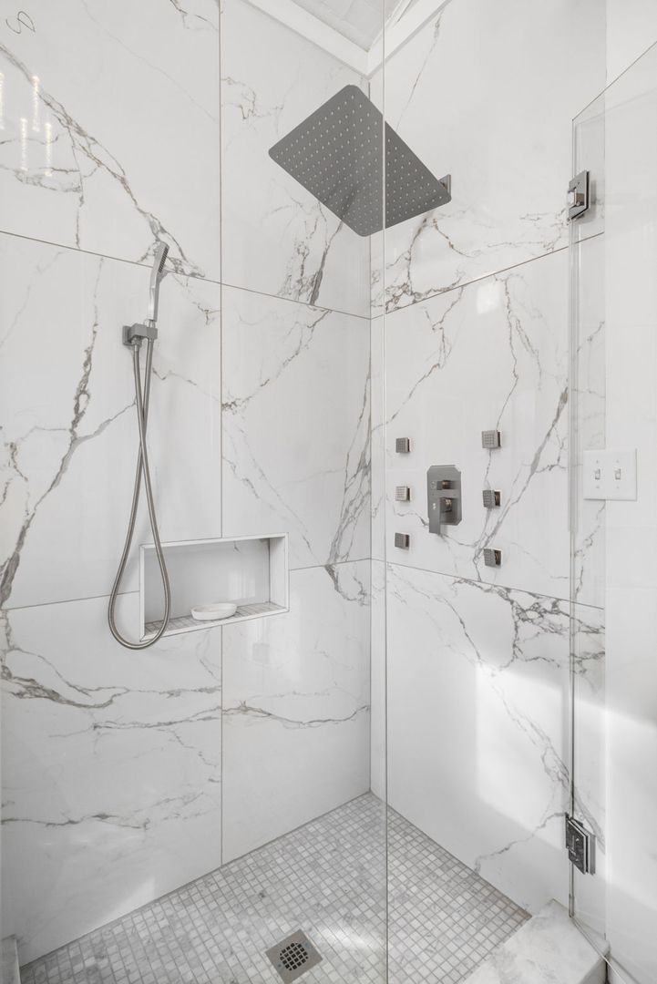 The bathroom features floor-to-ceiling marbled porcelain tiles, a custom-built shower with a glass enclosure, waterfall showerhead, body sprayers, and wand settings. A corner vanity with dual LED mirrors adds a touch of elegance.