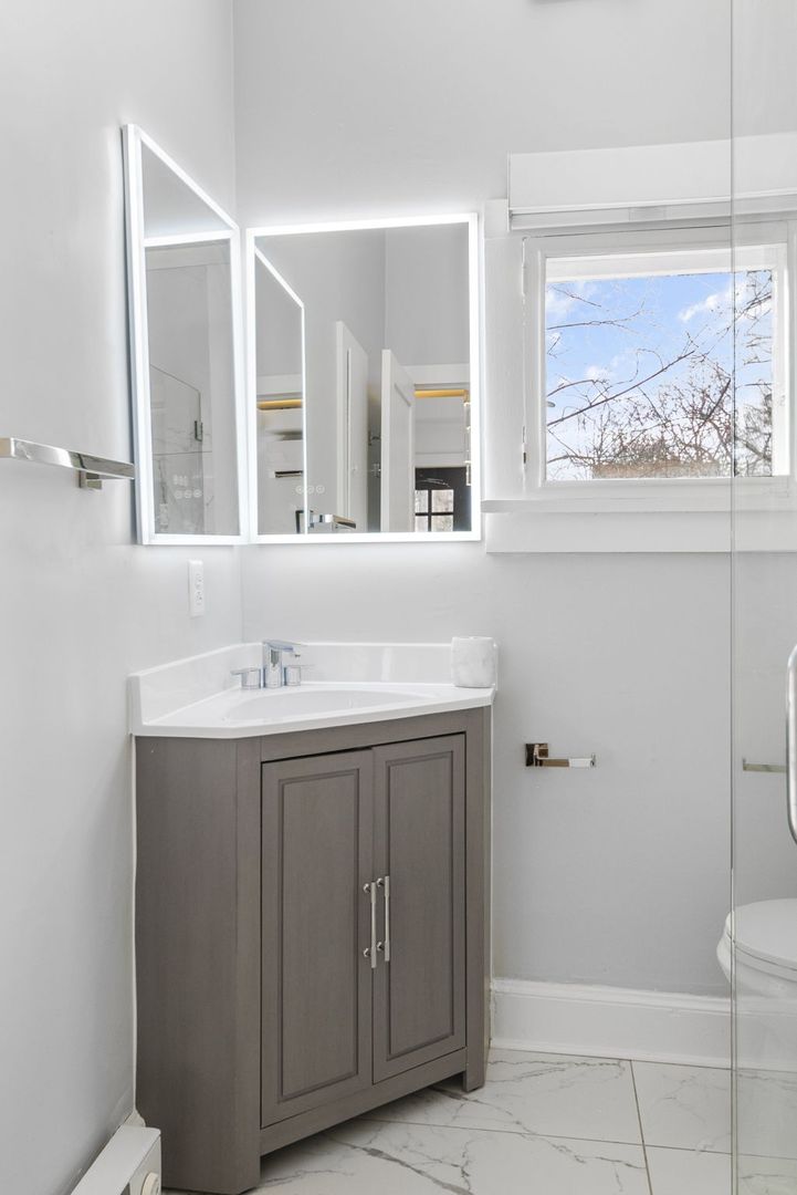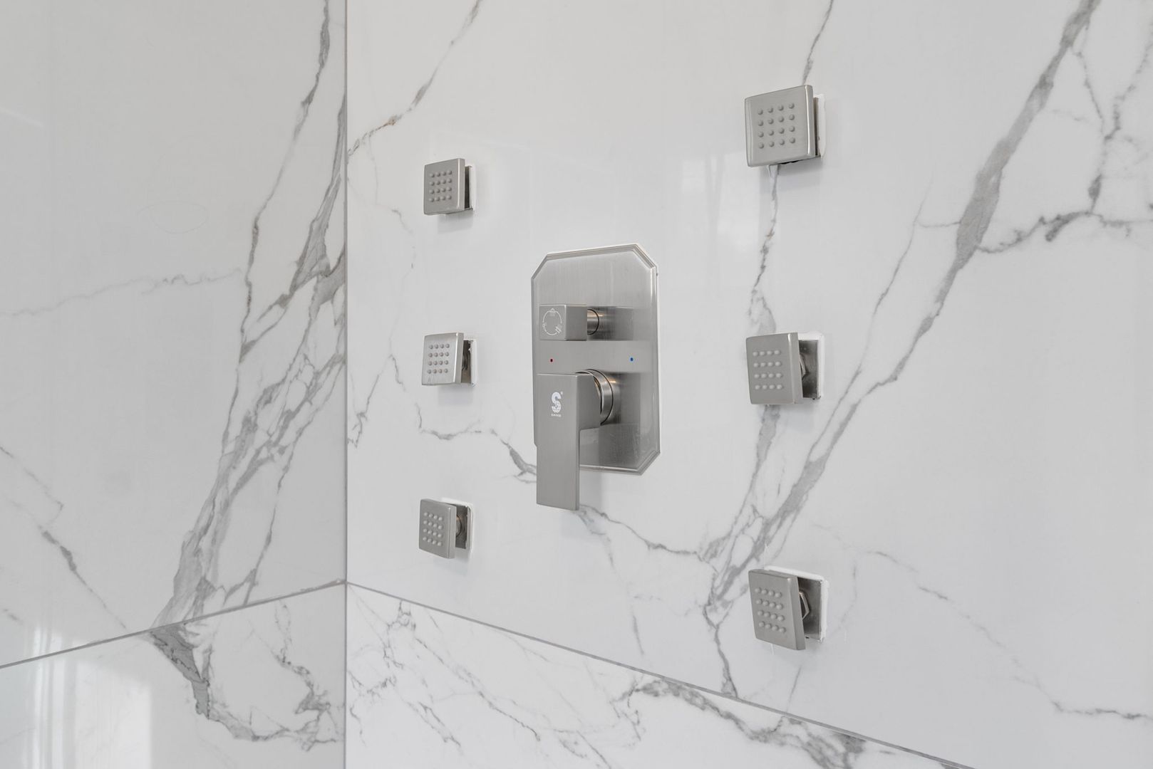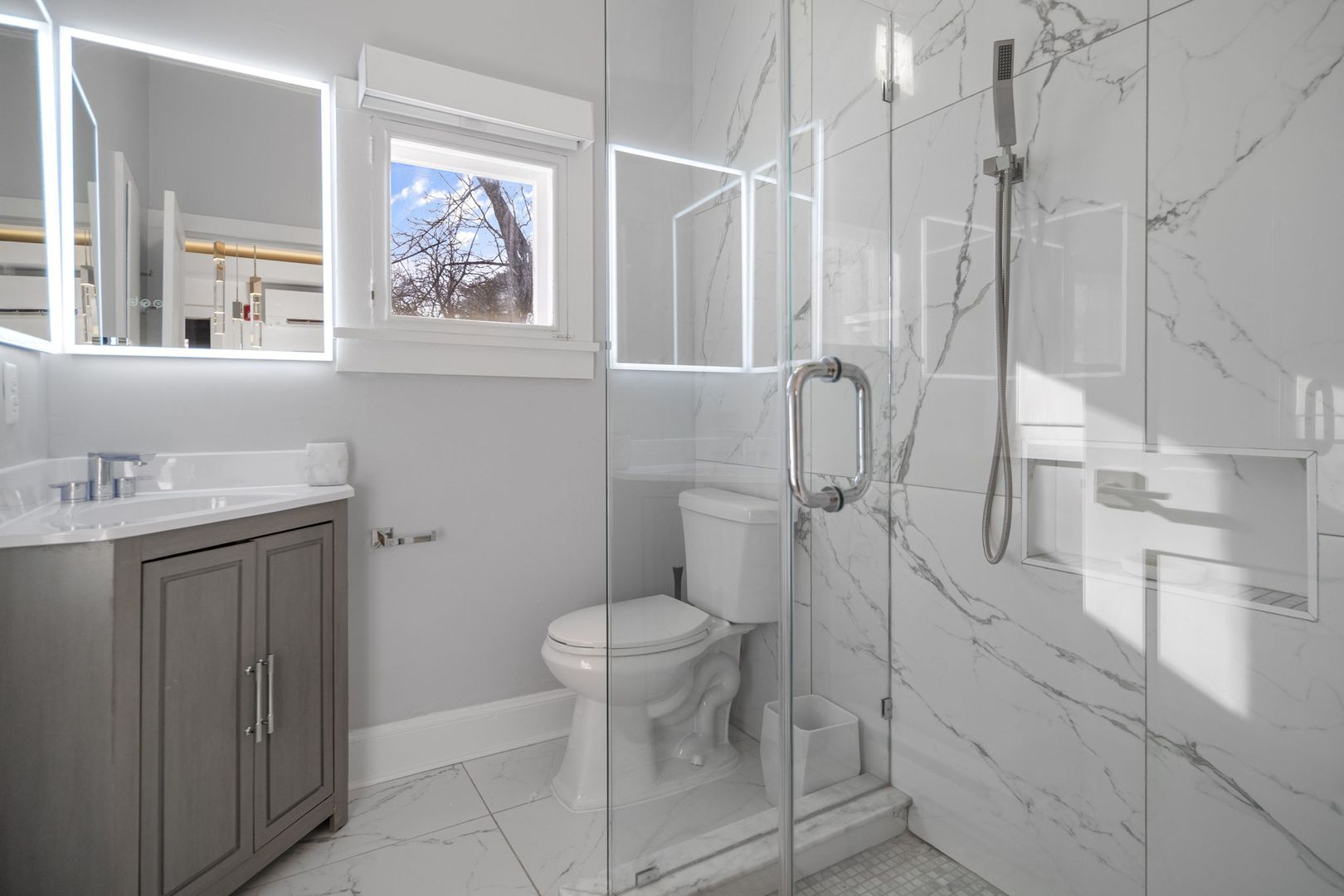 The bathroom features floor-to-ceiling marbled porcelain tiles, a custom-built shower with a glass enclosure, waterfall showerhead, body sprayers, and wand settings. A corner vanity with dual LED mirrors adds a touch of elegance.