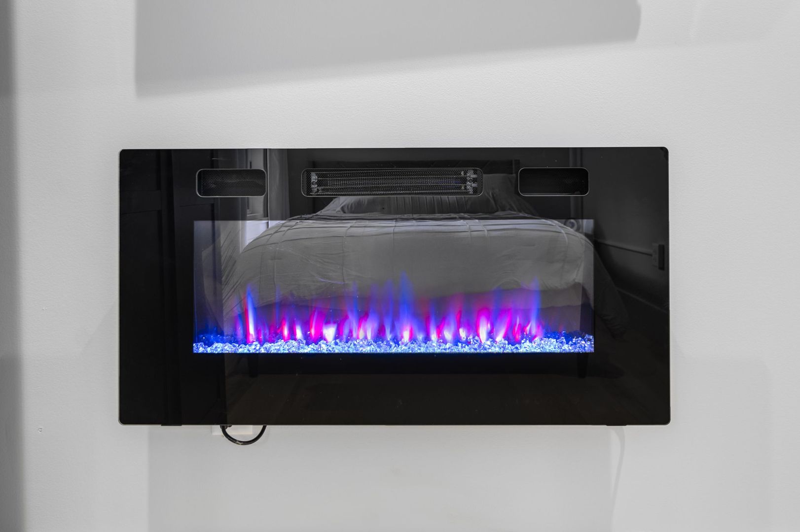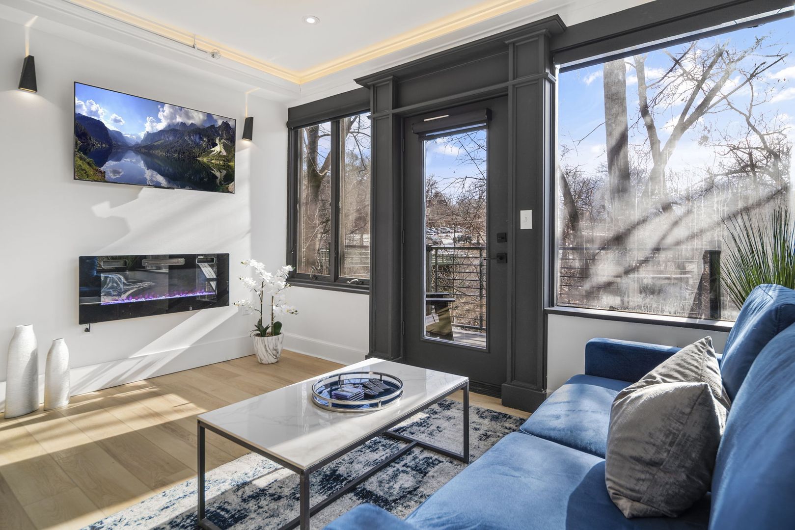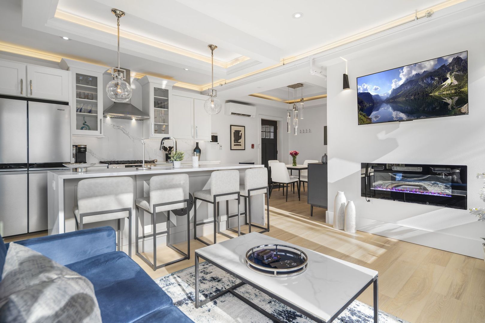 The living room is designed for comfort and style, featuring a crushed velvet full-size pull-out sofa, LED fireplace, and Smart TV—ideal for both relaxation and entertainment.
