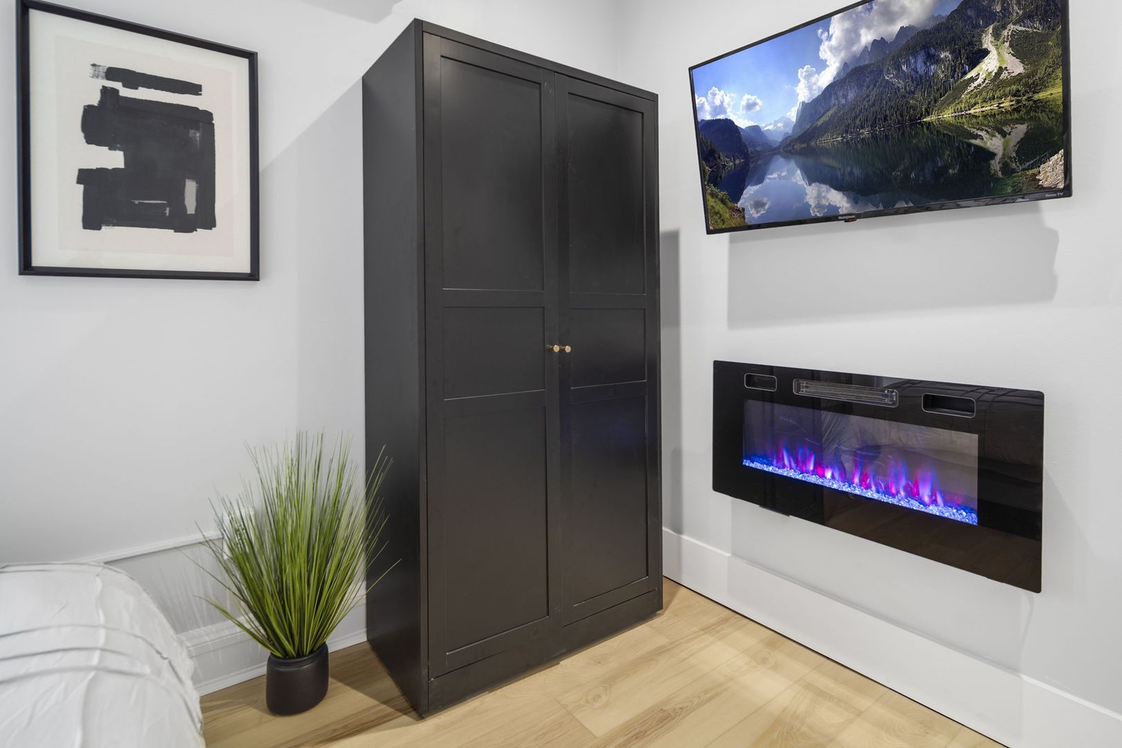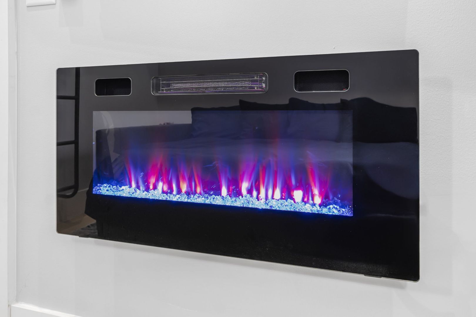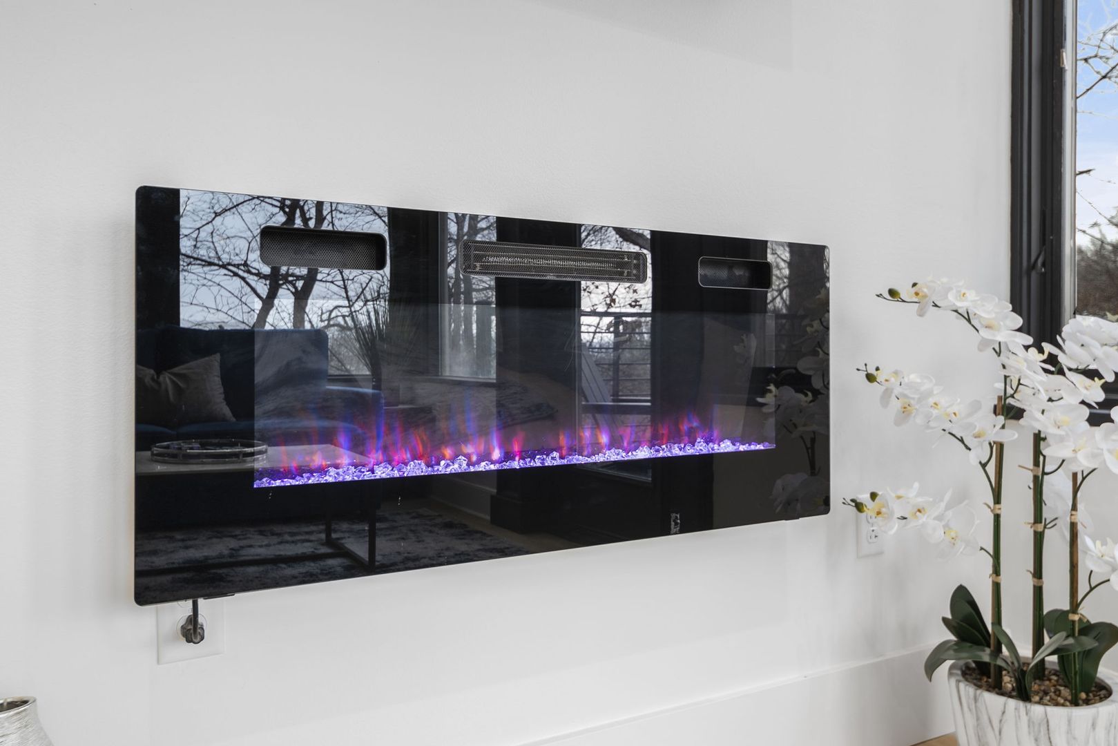 The living room is designed for comfort and style, featuring a crushed velvet full-size pull-out sofa, LED fireplace, and Smart TV—ideal for both relaxation and entertainment.