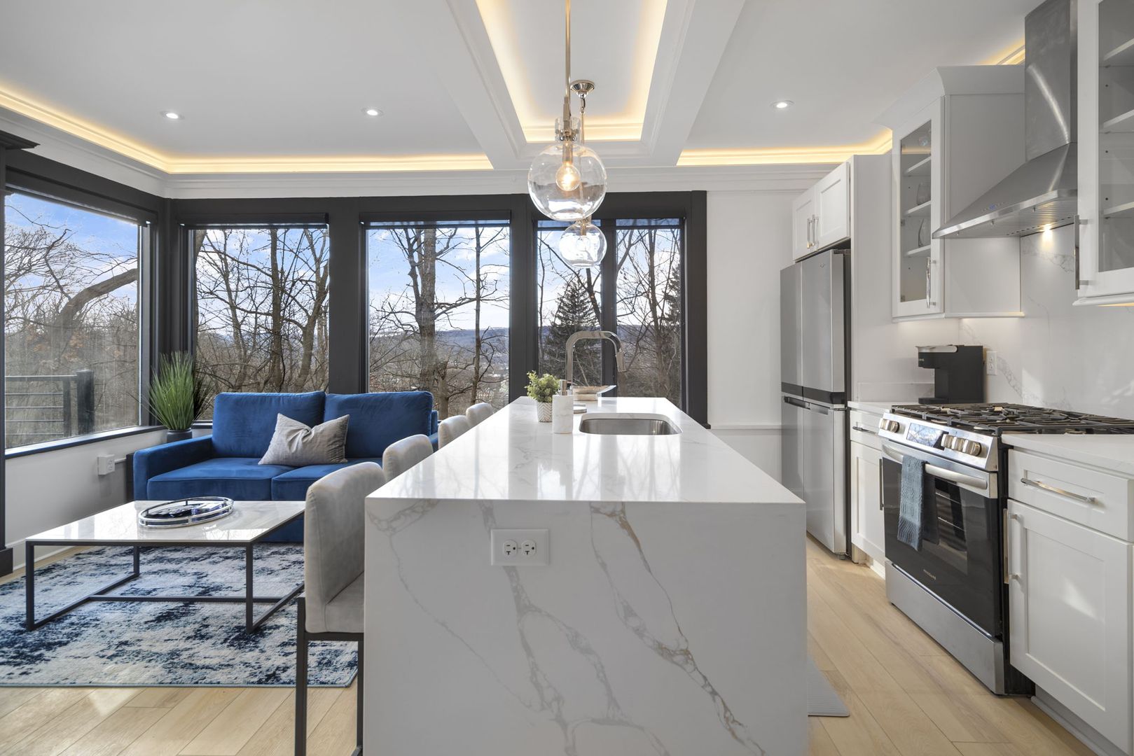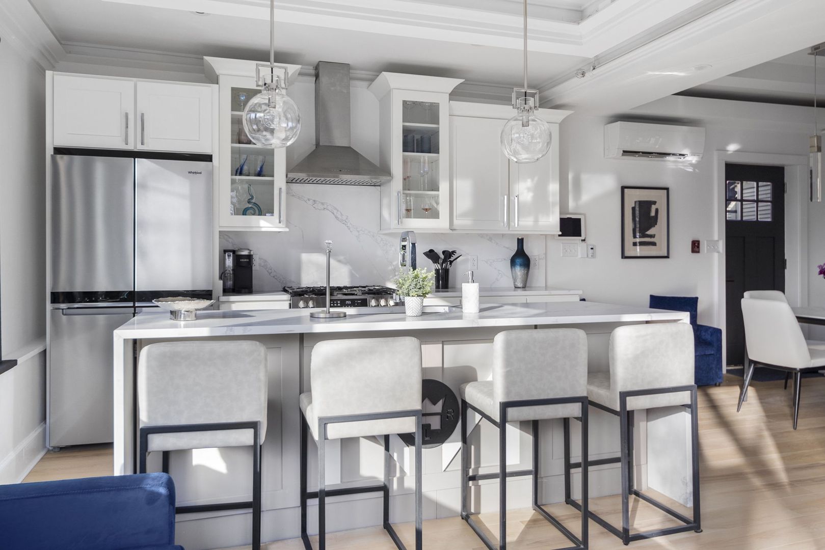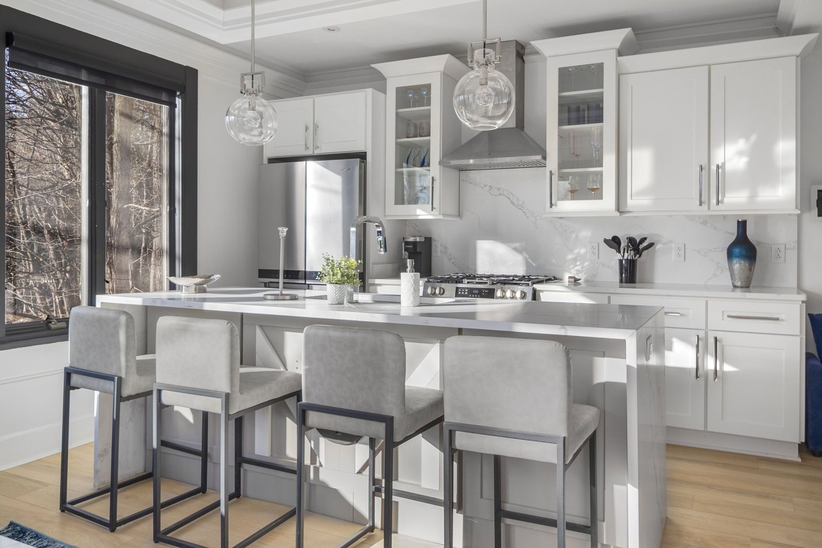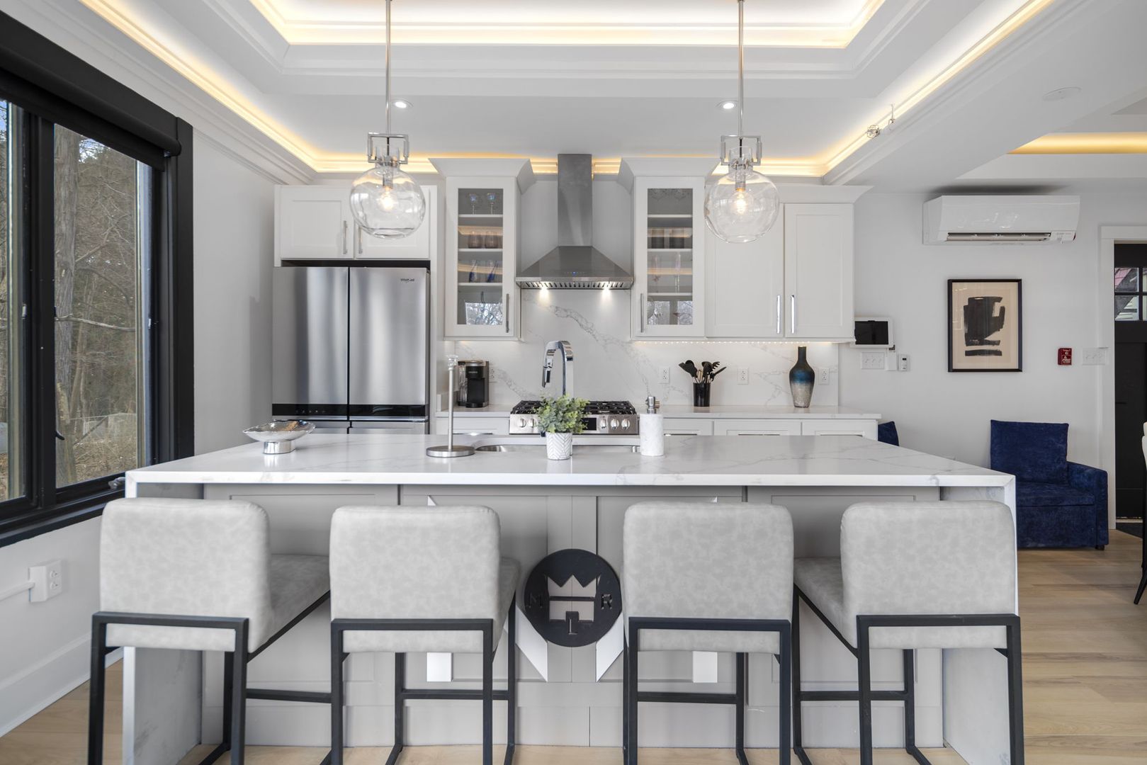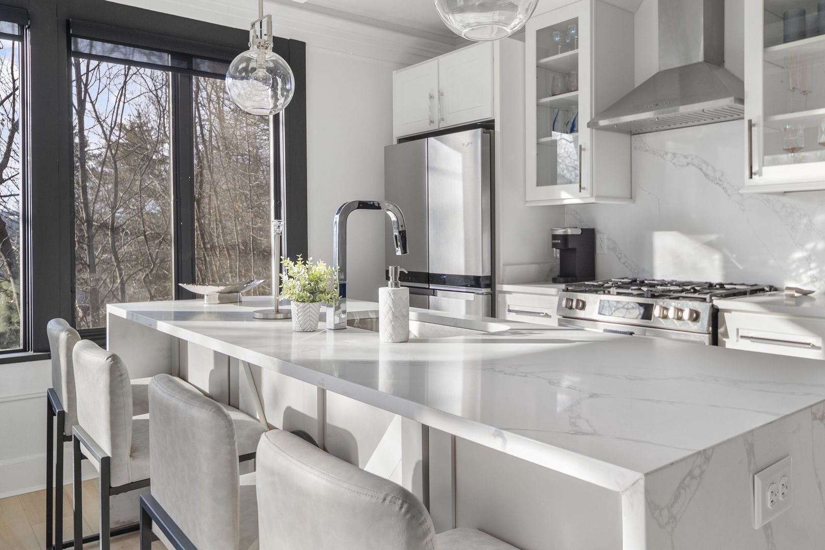 This modern kitchen boasts all stainless steel appliances, including a 4-panel French door fridge/freezer, gas range, and oven. The stunning waterfall-edge island offers seating for four and is complemented by a large kitchen sink, dishwasher, and under-counter built-in microwave.