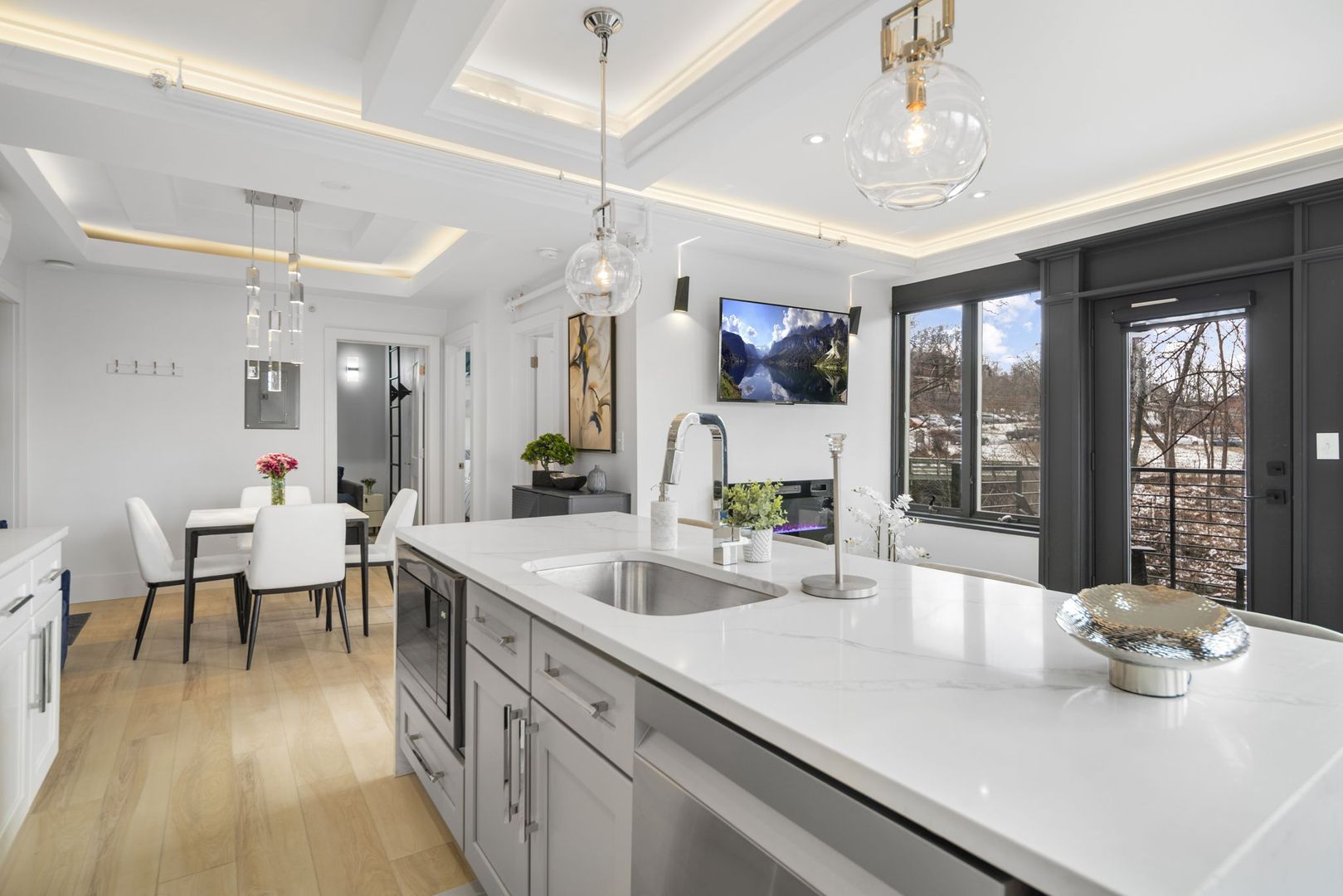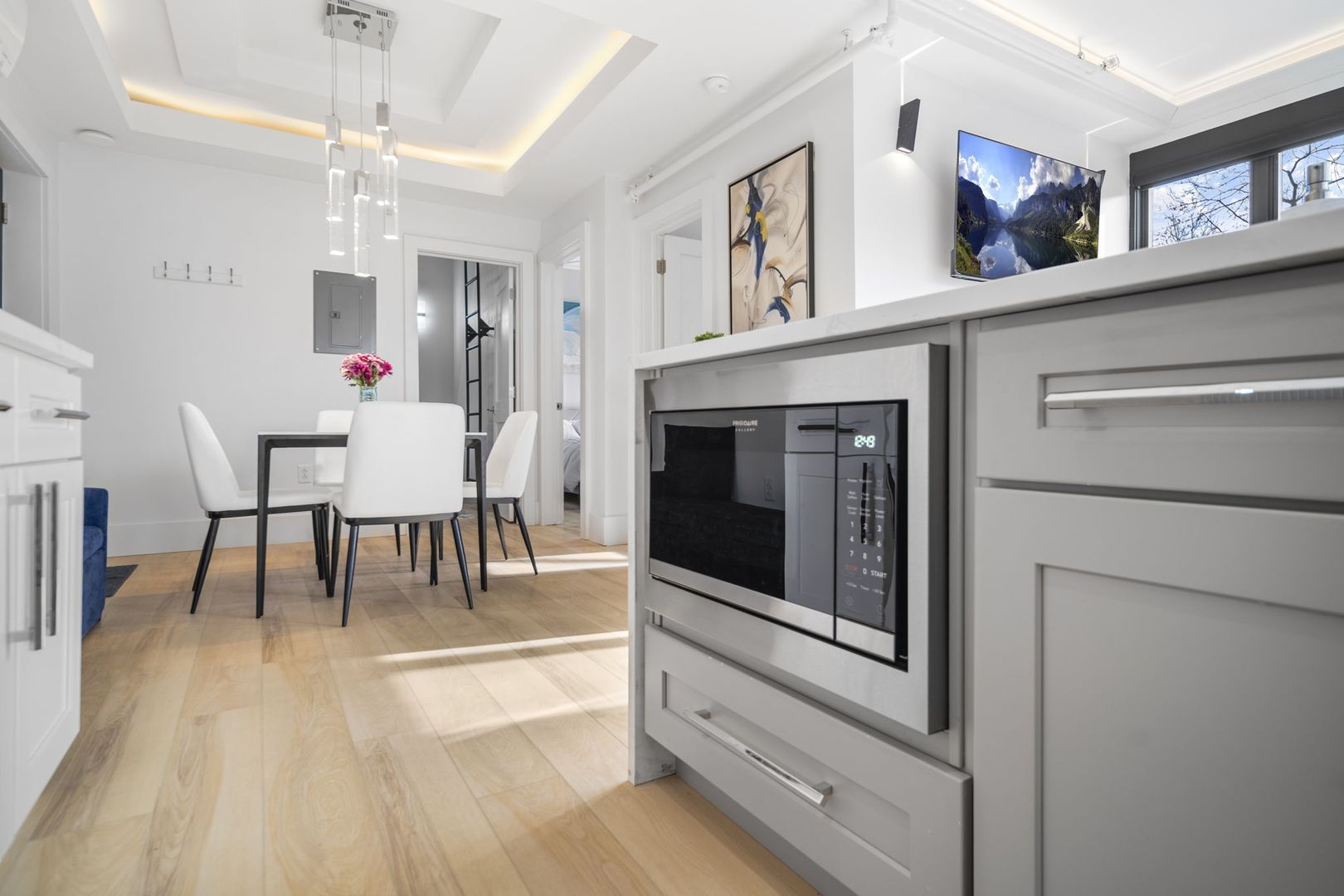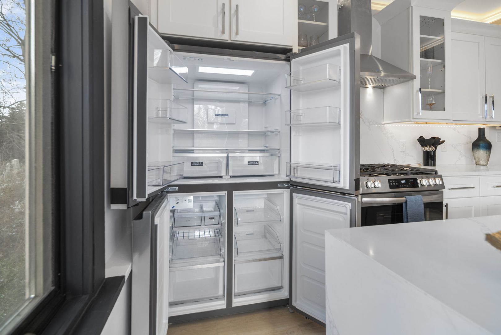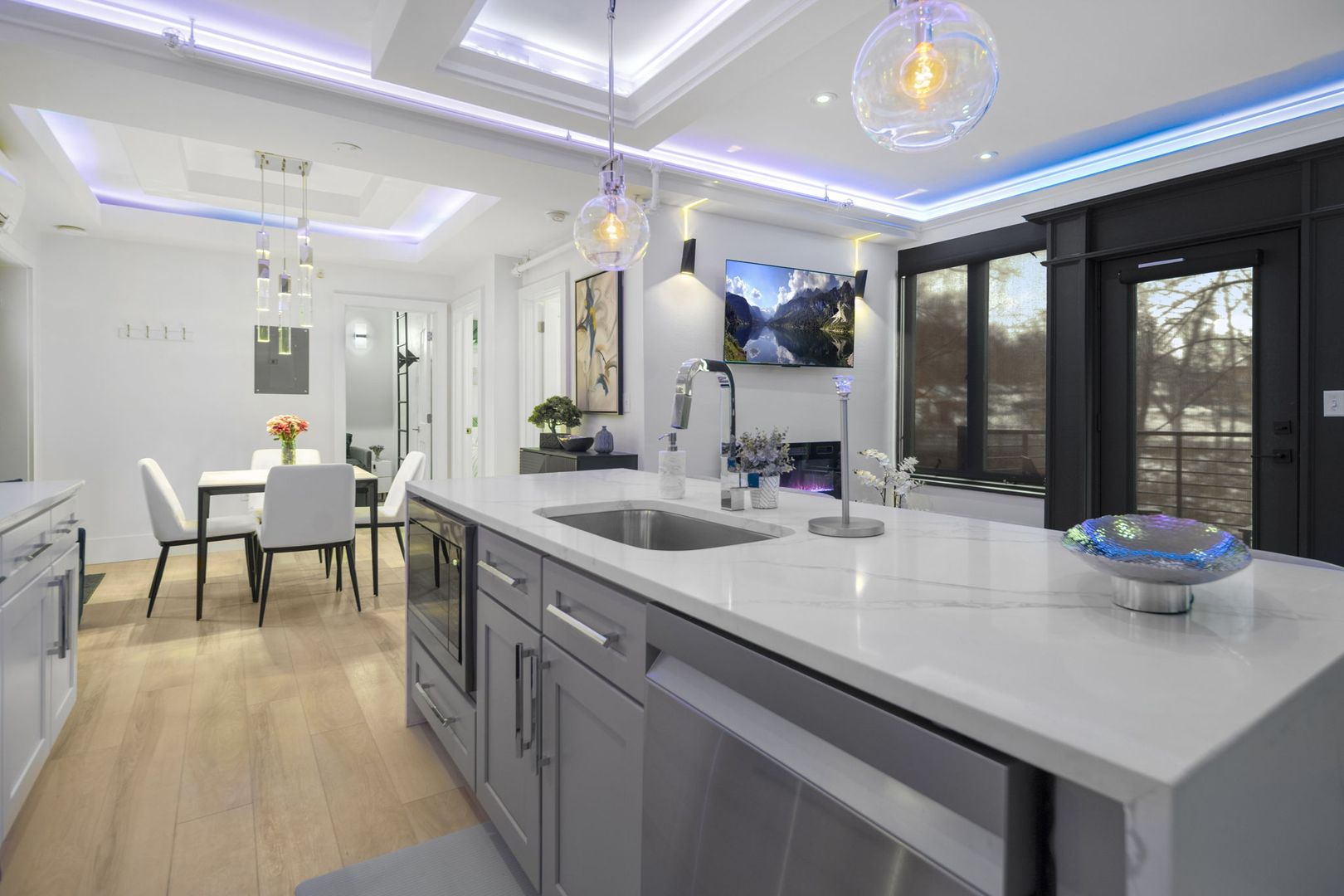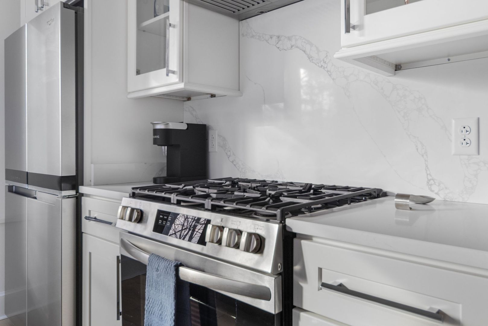 This modern kitchen boasts all stainless steel appliances, including a 4-panel French door fridge/freezer, gas range, and oven. The stunning waterfall-edge island offers seating for four and is complemented by a large kitchen sink, dishwasher, and under-counter built-in microwave.