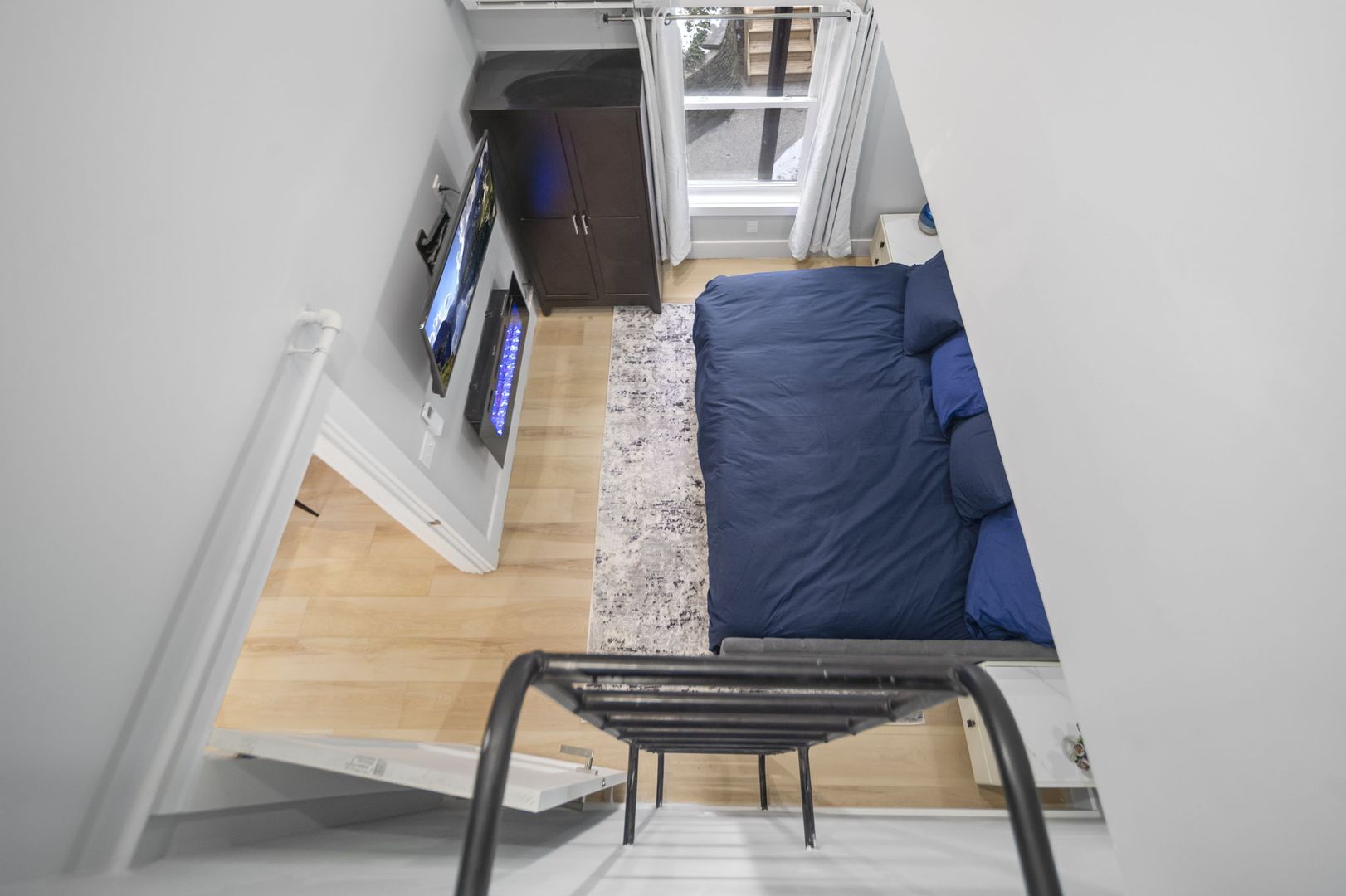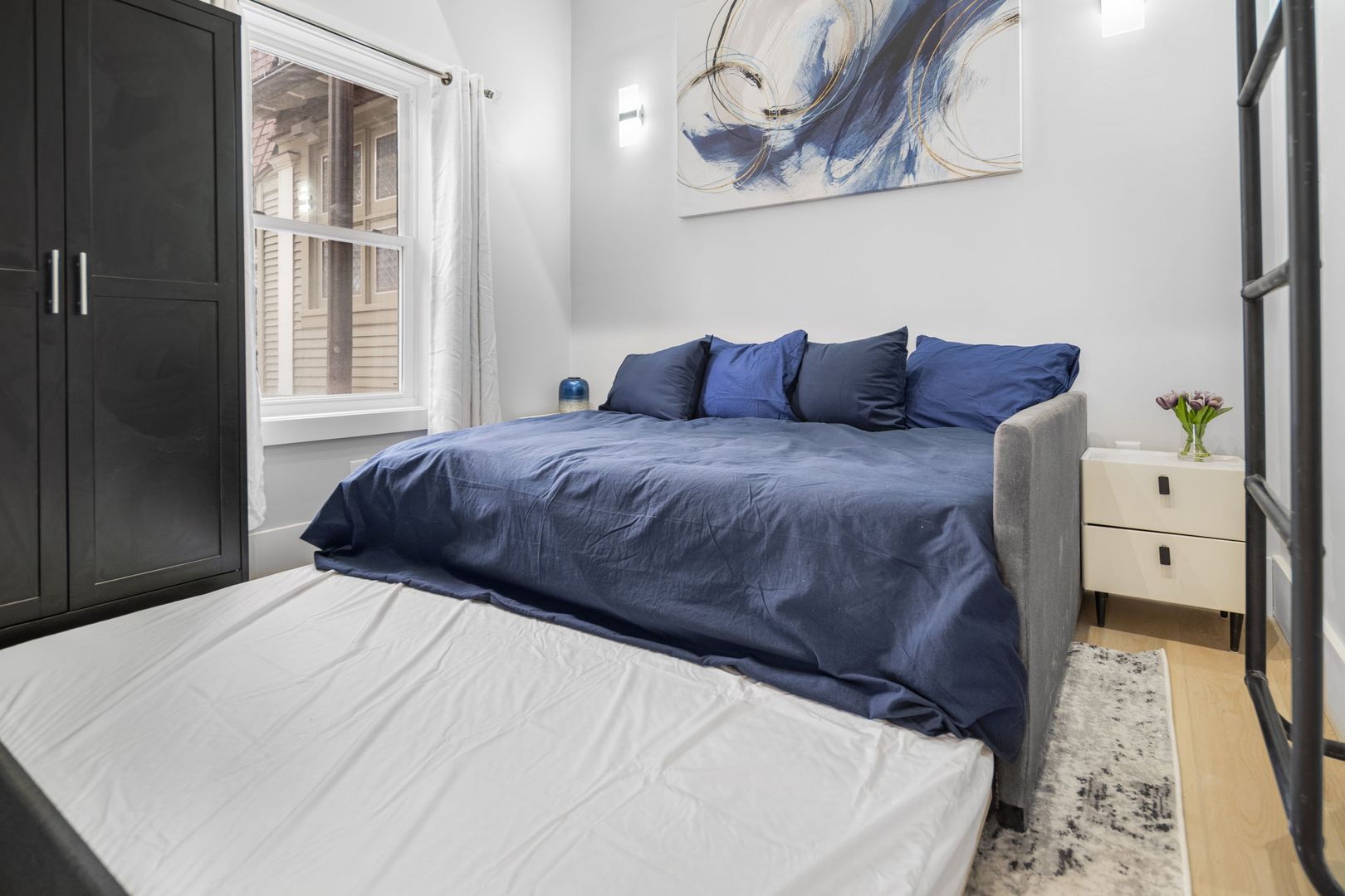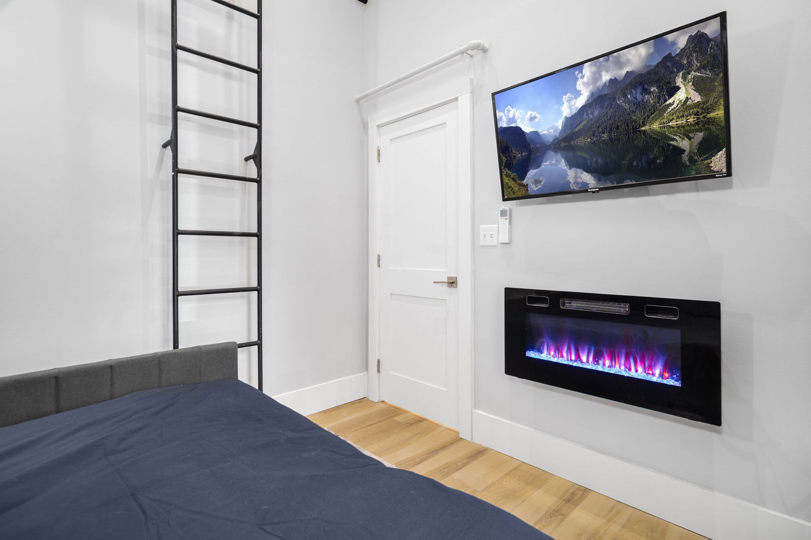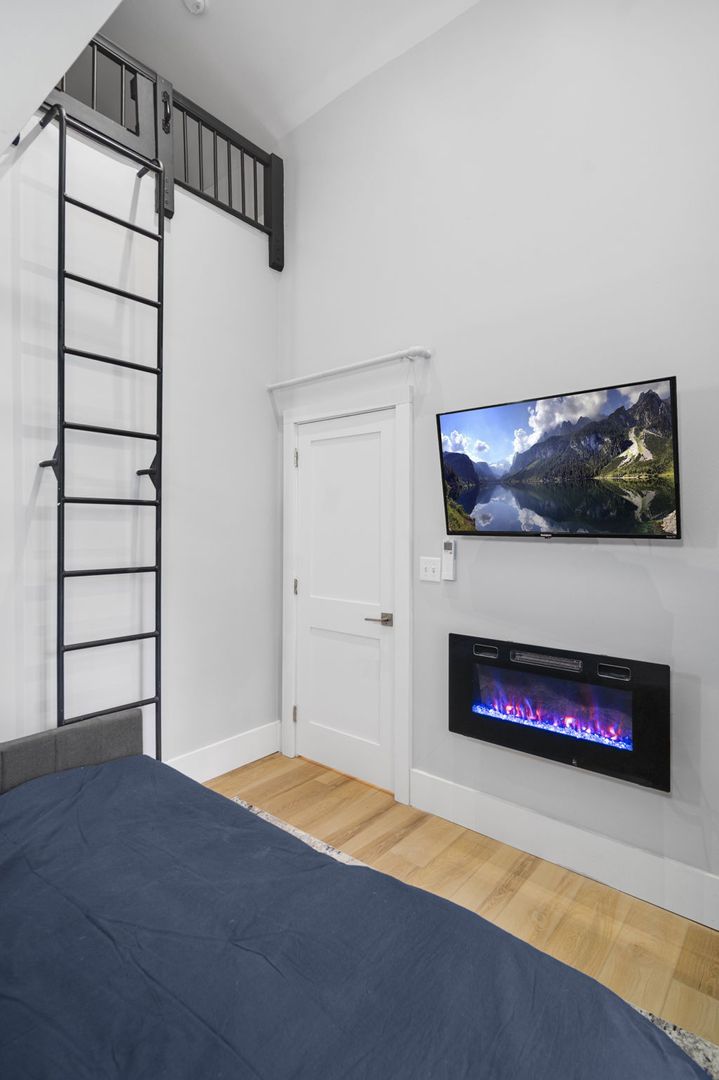 Both bedrooms are furnished with premium memory foam mattresses on full-size beds, and each comes with an LED fireplace and Smart TV. The secondary bedroom includes a pull-out trundle bed and a cozy lofted reading nook, perfect for relaxation.