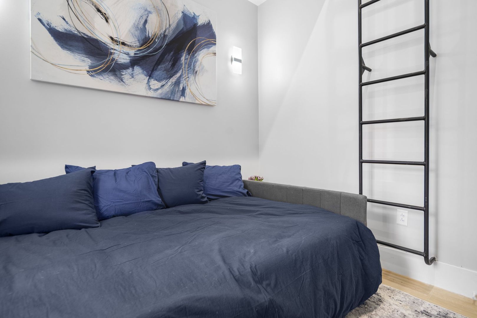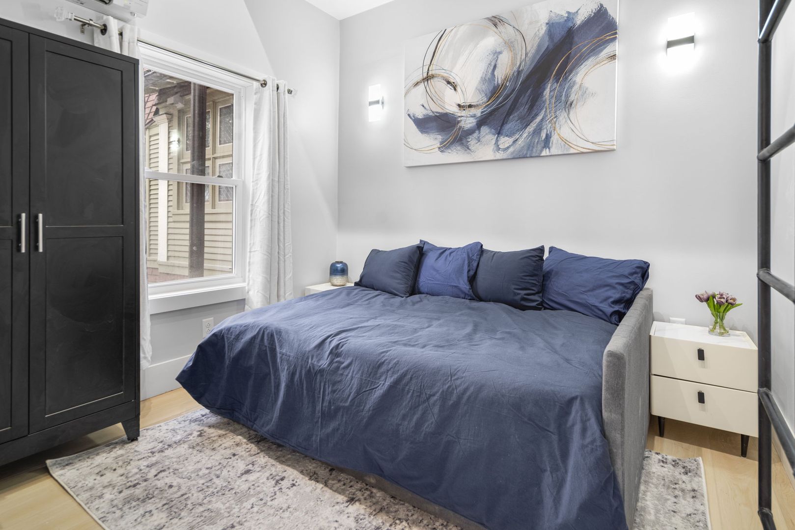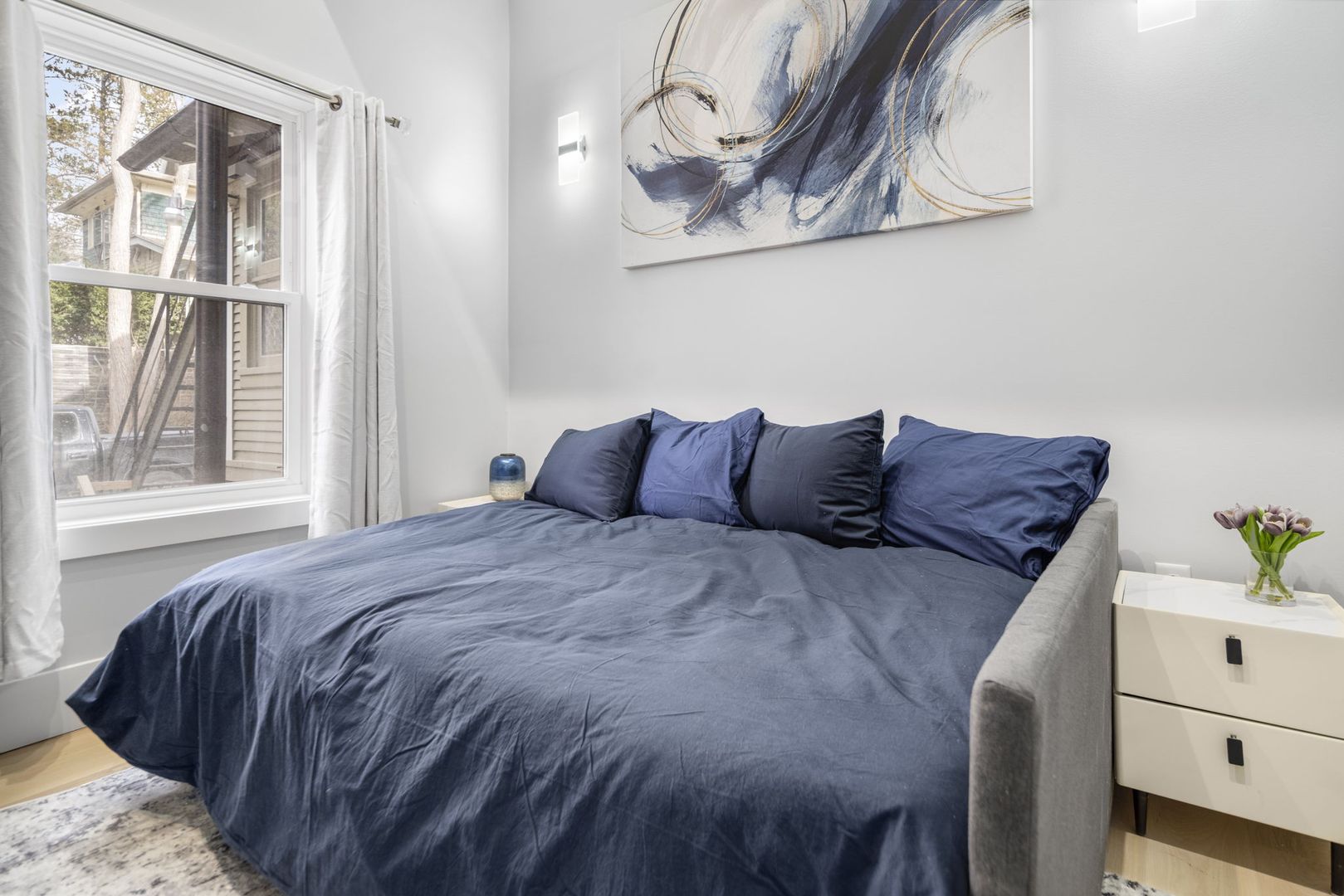 Both bedrooms are furnished with premium memory foam mattresses on full-size beds, and each comes with an LED fireplace and Smart TV. The secondary bedroom includes a pull-out trundle bed and a cozy lofted reading nook, perfect for relaxation.