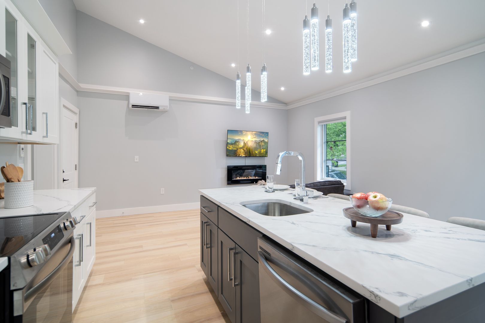 A chef-inspired gourmet kitchen with stainless steel appliances and luxe marbled quartz countertops