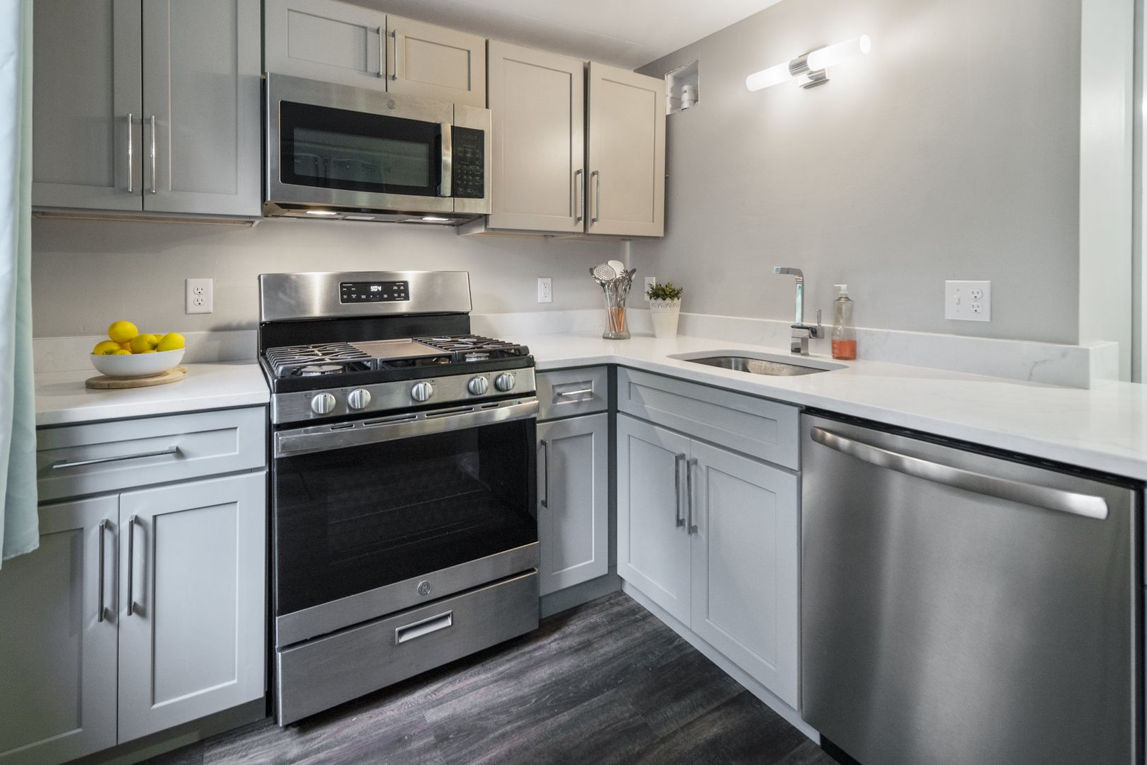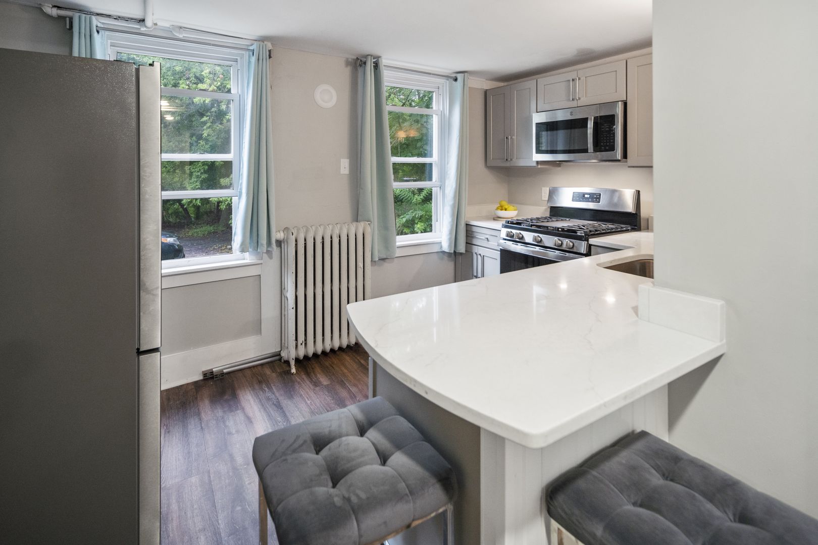 This 2 bedroom apartment was extensively renovated in the summer of 2021. New features will include ALL BRAND NEW granite counters, luxury vinyl tiling, stainless steel appliances, and light fixtures. The kitchen will offer a new stove, fridge, and dishwasher and contemporary kitchen cabinets with metal hardware. Bathroom renovations include new flooring, touch-activated LED lights, and an updated vanity and shower.