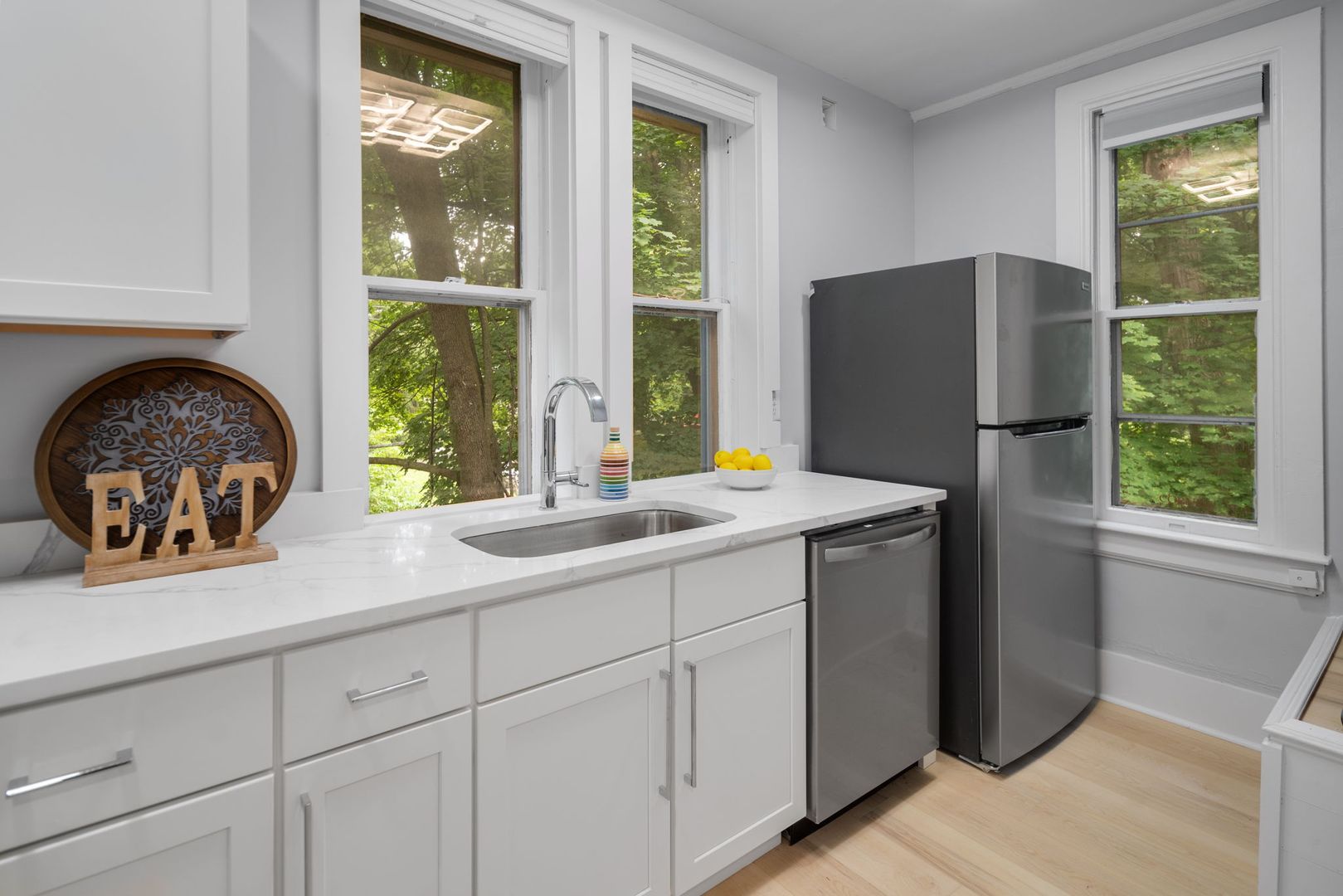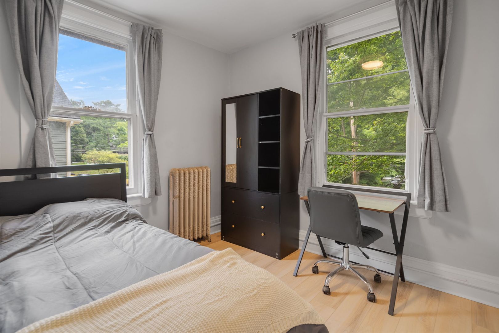 Each apartment comes fully furnished and features all new kitchens, upgraded bathrooms, new flooring and remodeled living and bedroom areas. Enjoy this home's classic charm blended with modern amenities like custom tile baths, LED vanity mirrors, smart lights and digital door access. The kitchens feature a full suite of new stainless steel appliances, wood cabinets, and quartz countertops. Common areas feature new furnishings including wall-mounted flat screen TVs and space for living and dining accordingly. Additional Furnishings include a couch, dining room table and chairs or kitchen counter seating, full size bed frame and mattress, desks and desk chair, and closet and dressers or large armoire in each bedroom.