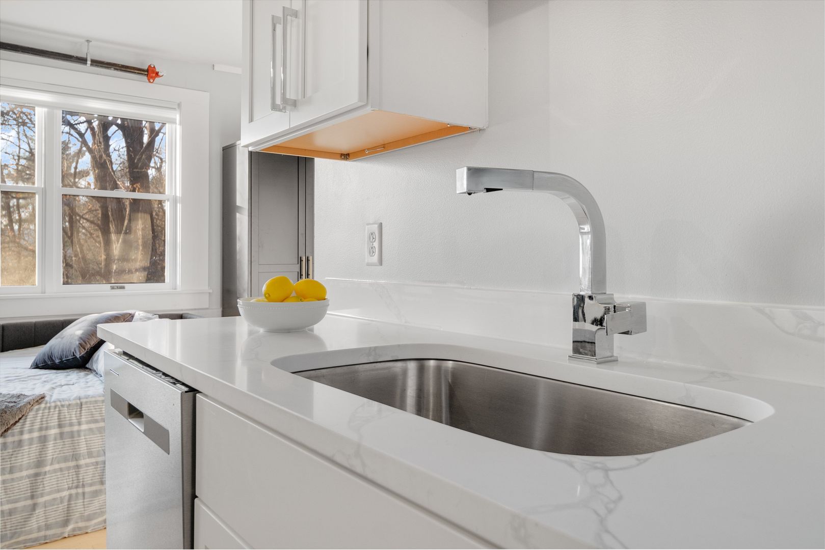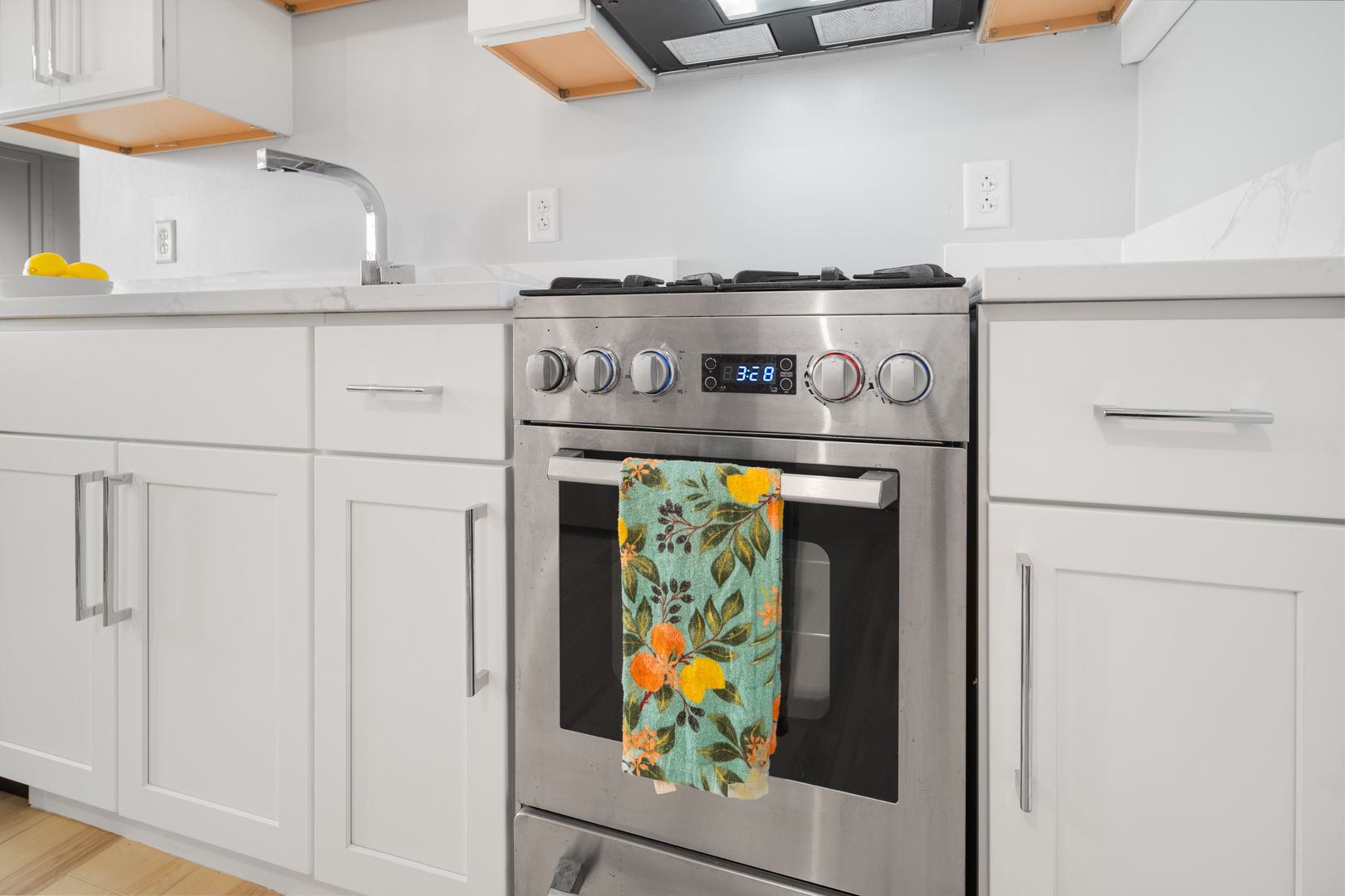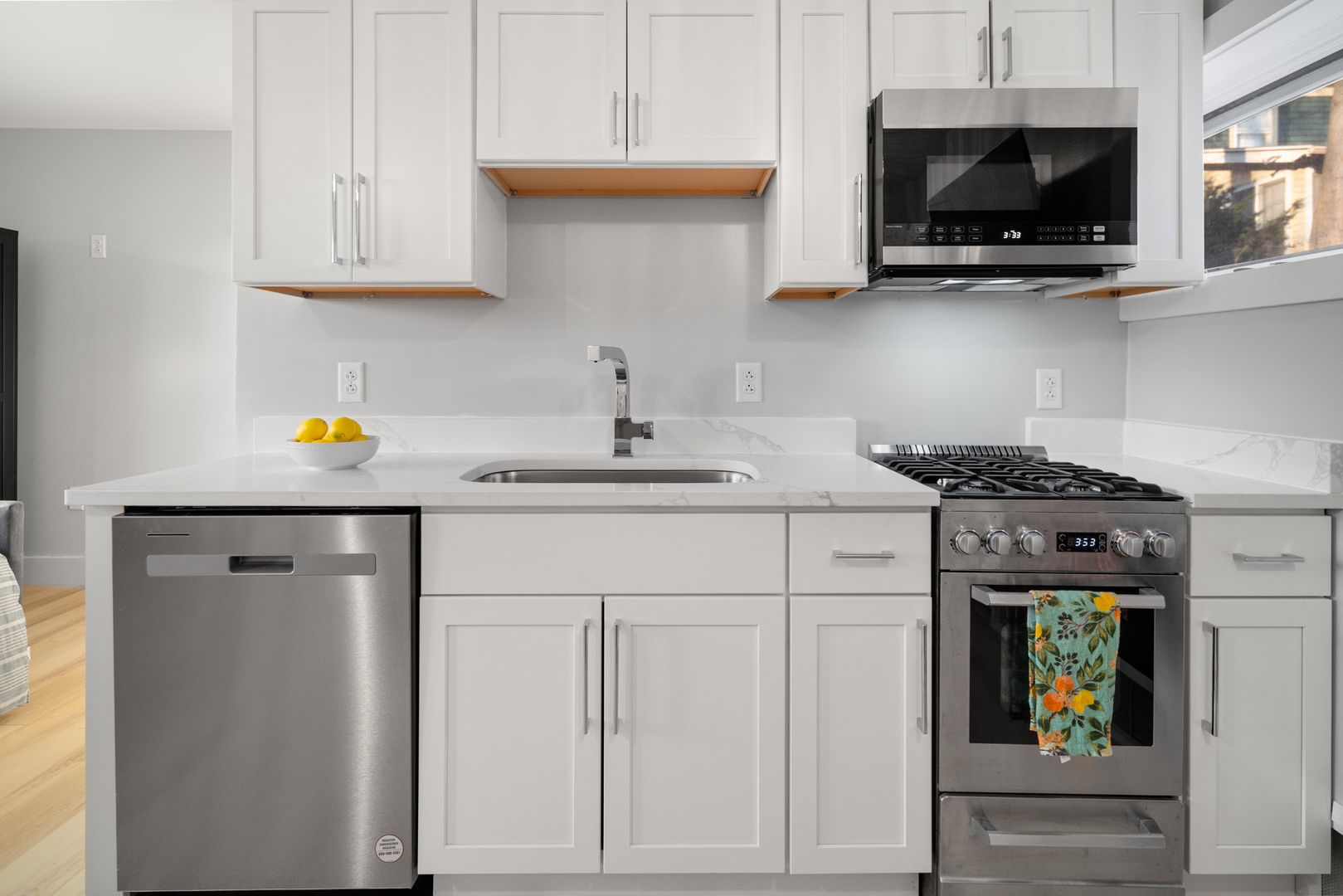 The kitchens feature a full suite of new stainless steel appliances, wood cabinets, and quartz countertops.