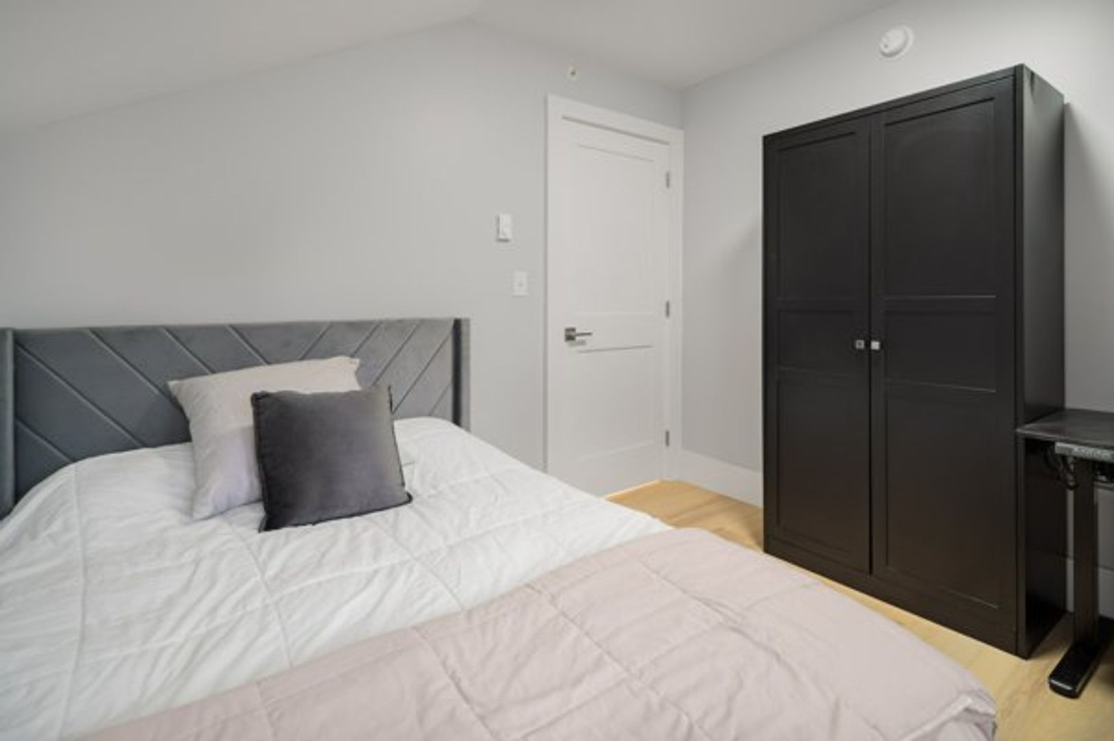 The kitchens feature stainless steel appliances, wood cabinetry, and quartz countertops. Living areas are outfitted with comfortable furnishings, including wall-mounted flat-screen TVs, a sofa, dining table with chairs or counter seating. Each bedroom comes with a full-size bed and mattress, desk and chair, and either a built-in closet with dresser or a large armoire.