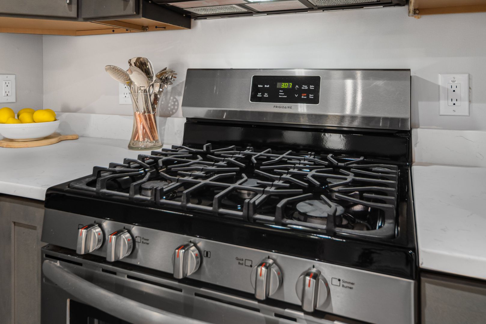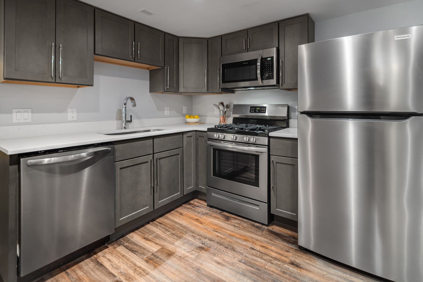 The eat-in kitchen is a highlight of the apartment, featuring brand-new stainless steel appliances including a dishwasher, built-in microwave, and gas stove—perfect for home cooking and easy cleanup. The kitchen is fully equipped with ample cabinetry, solid-surface countertops, and a cozy dining area with a table and seating for four, making it an ideal space for shared meals or quiet study sessions.