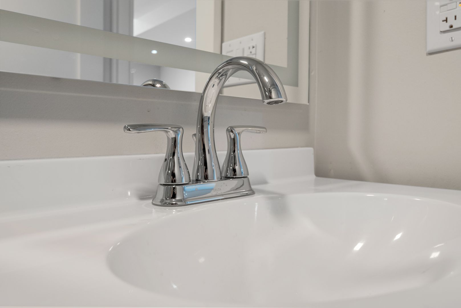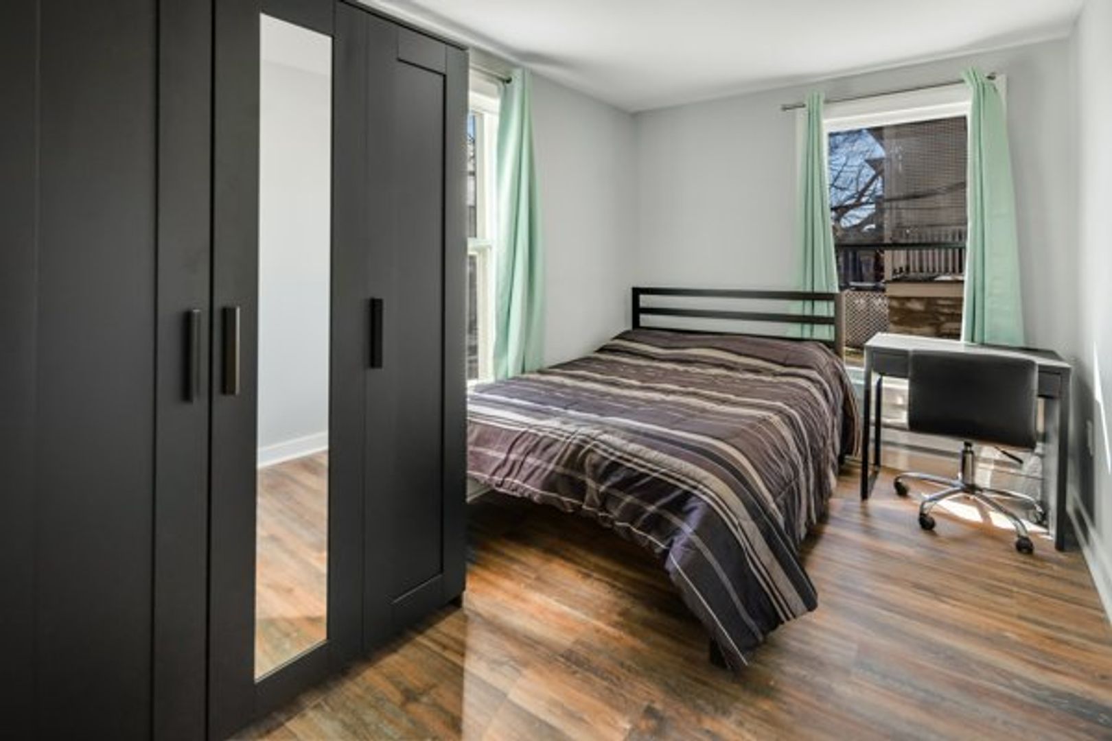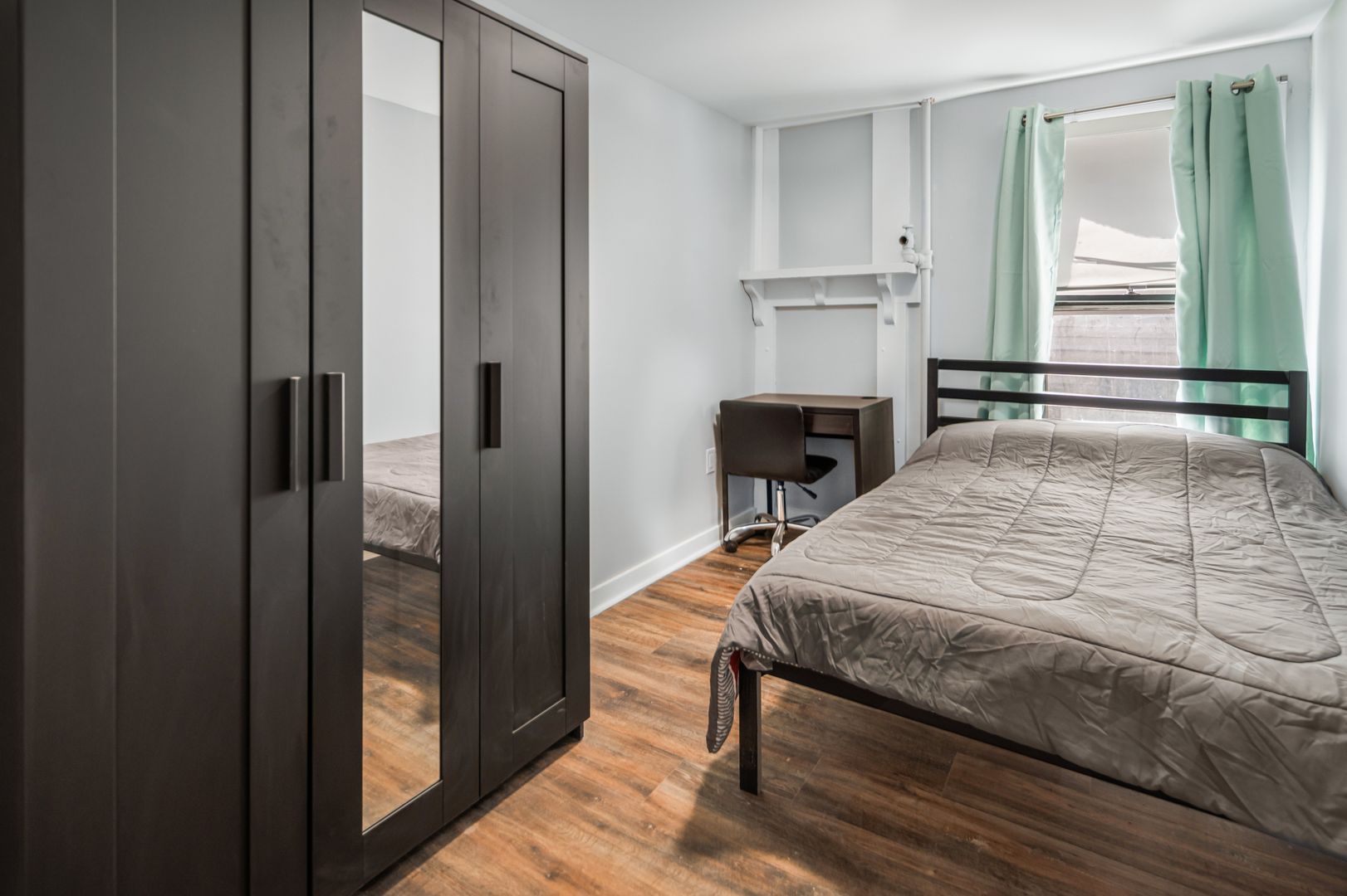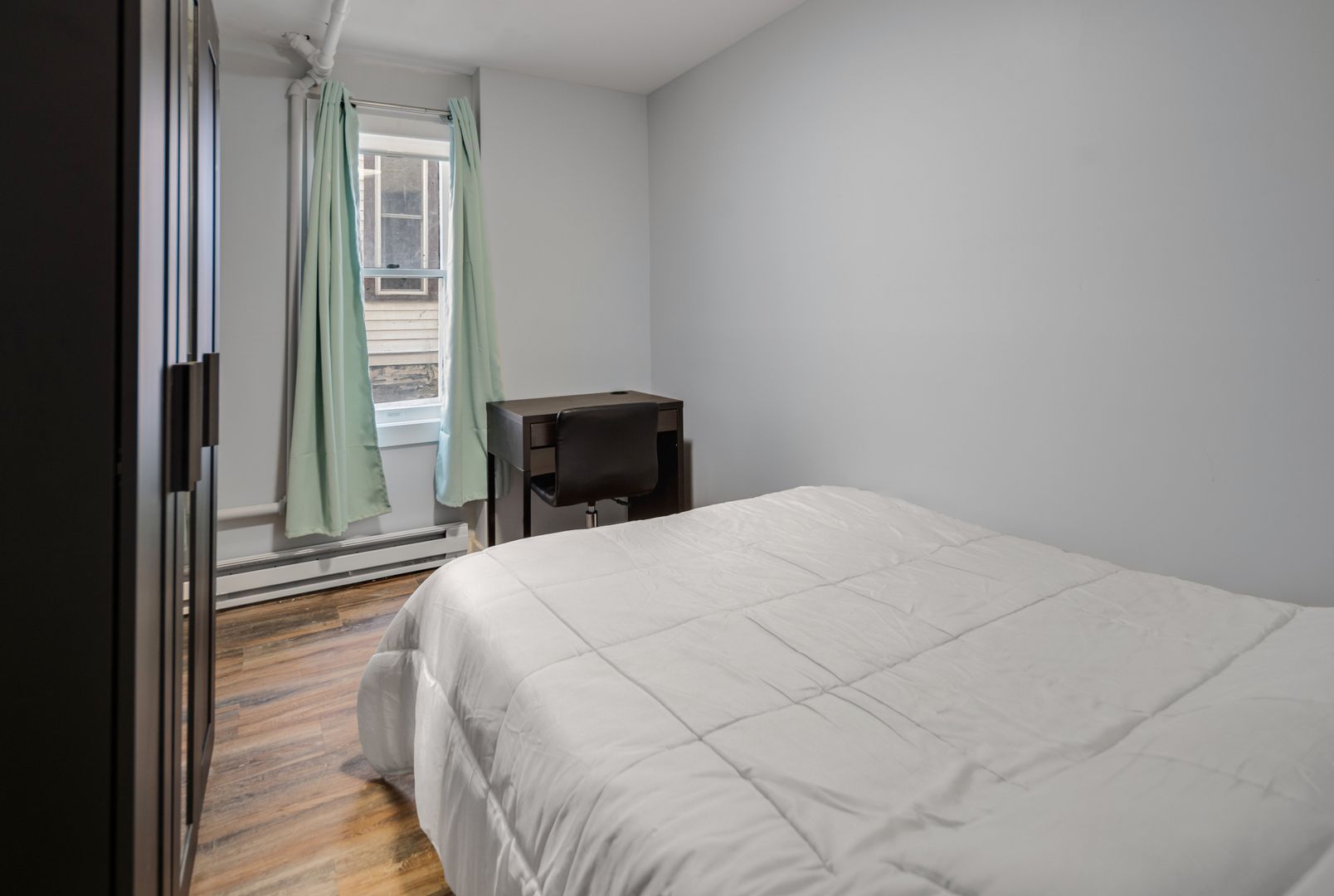 The bathroom showcases a custom-tiled shower with modern fixtures and an LED defogging vanity mirror, providing a touch of spa-like luxury. Each of the three bedrooms comes furnished with a full-size bed, desk and chair, and armoire, creating private and functional spaces for both rest and productivity. The living room is furnished with a comfortable sofa and a 50" wall-mounted smart TV, offering the perfect setting for relaxing with friends or unwinding after a long day. The apartment’s fun and artistic lighting fixtures add a unique personality to the space, blending modern style with comfort.