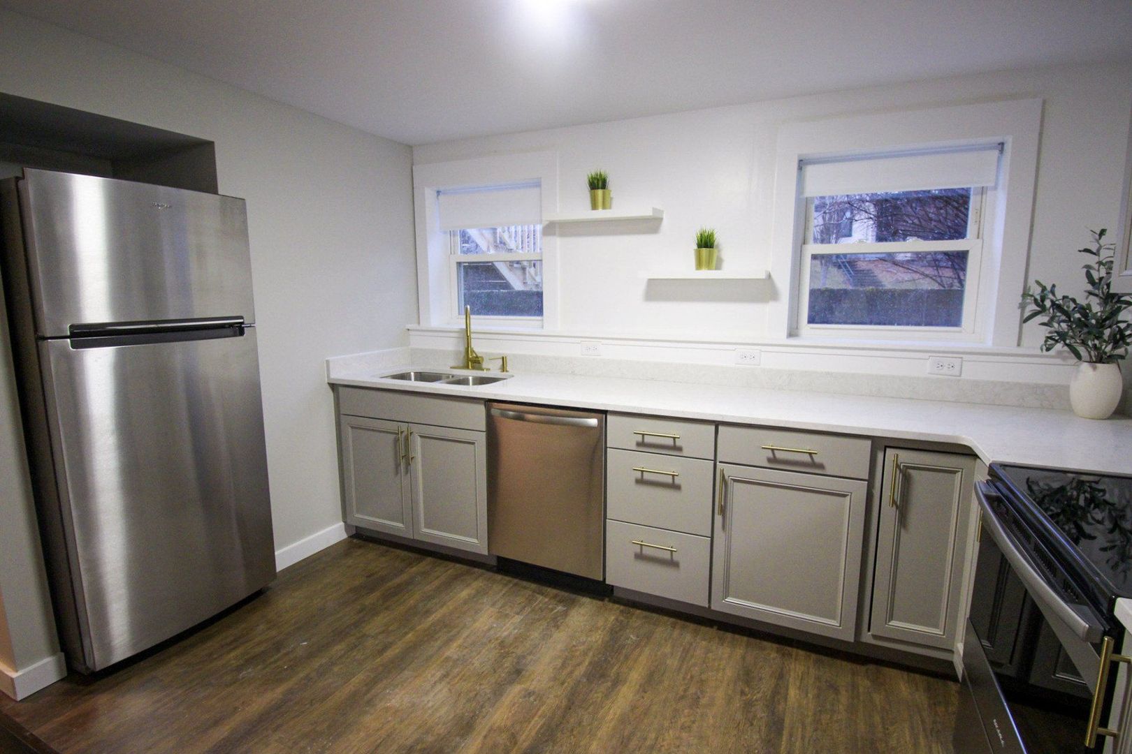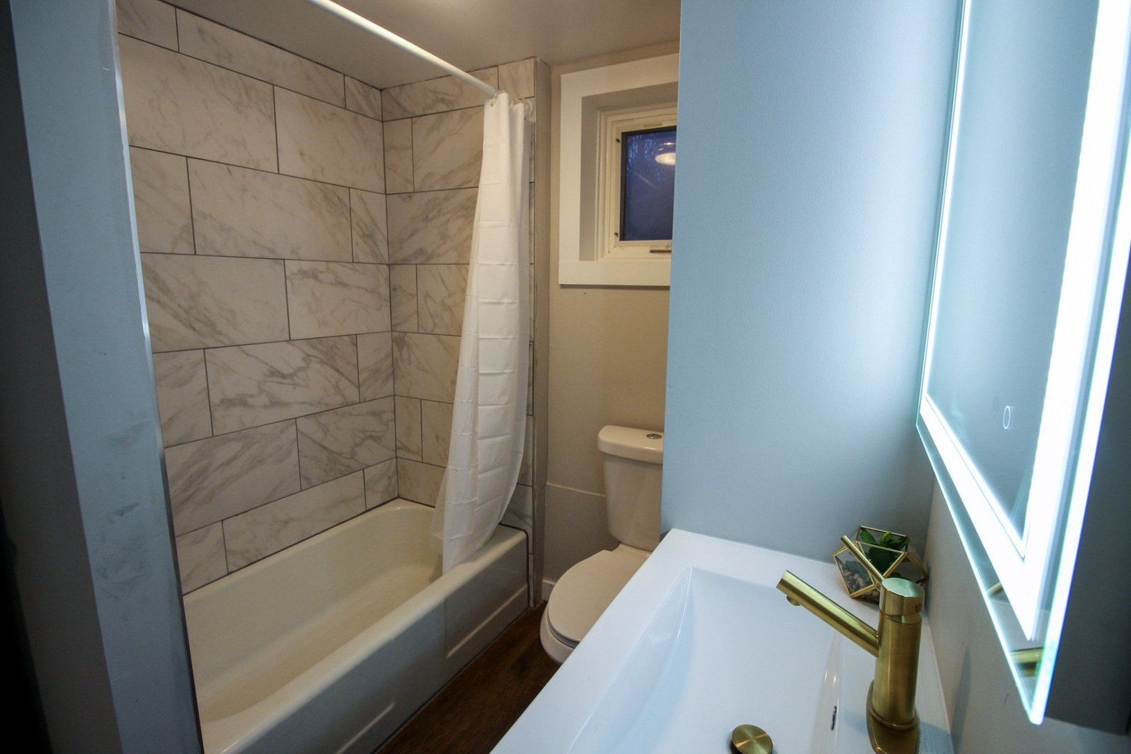 The kitchen offers gorgeous marbled quartz countertops, contemporary stainless steel appliances, and brushed nickel fixtures. The bathroom has a tiled shower, a new vanity, and a touch-activated LED mirror.
