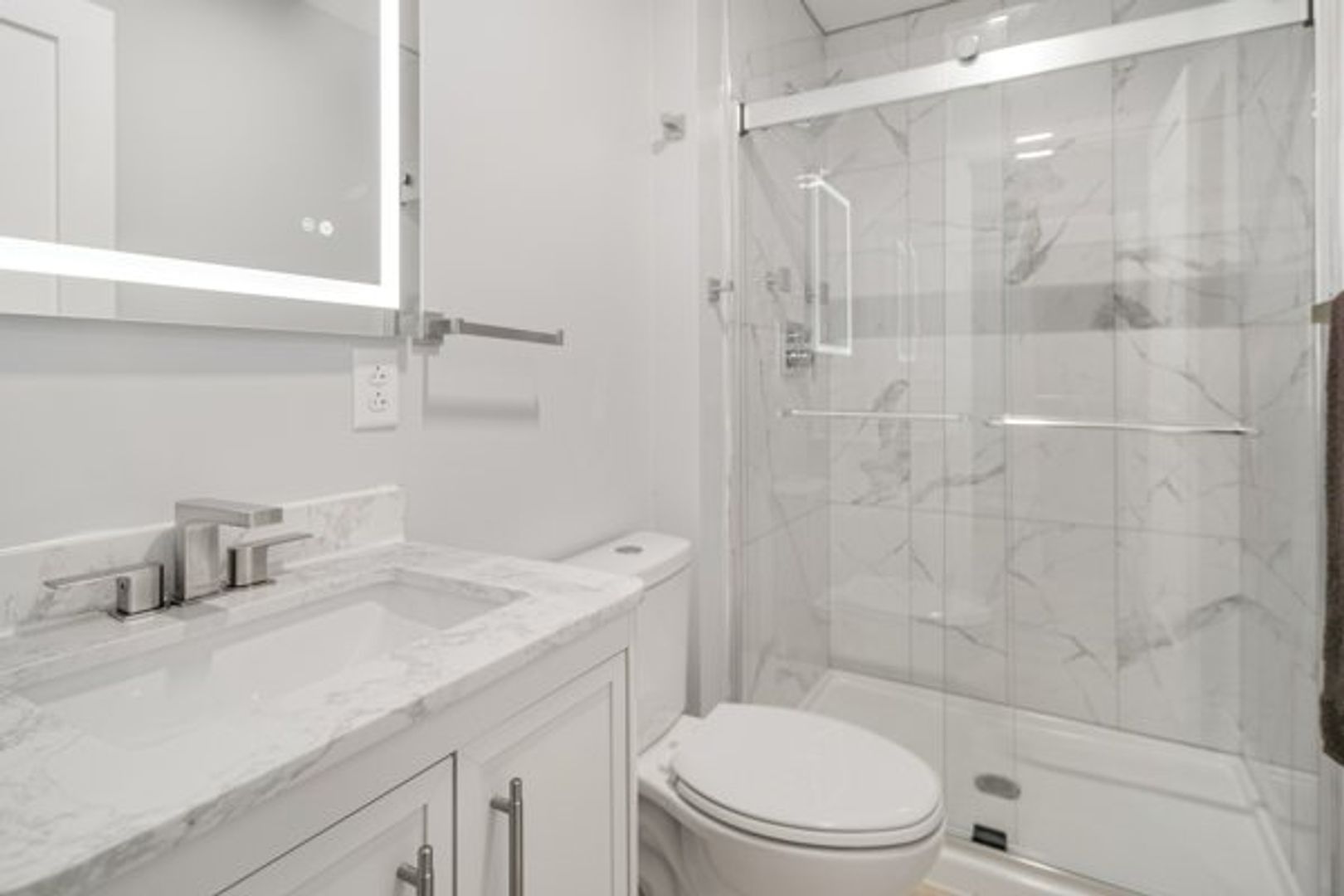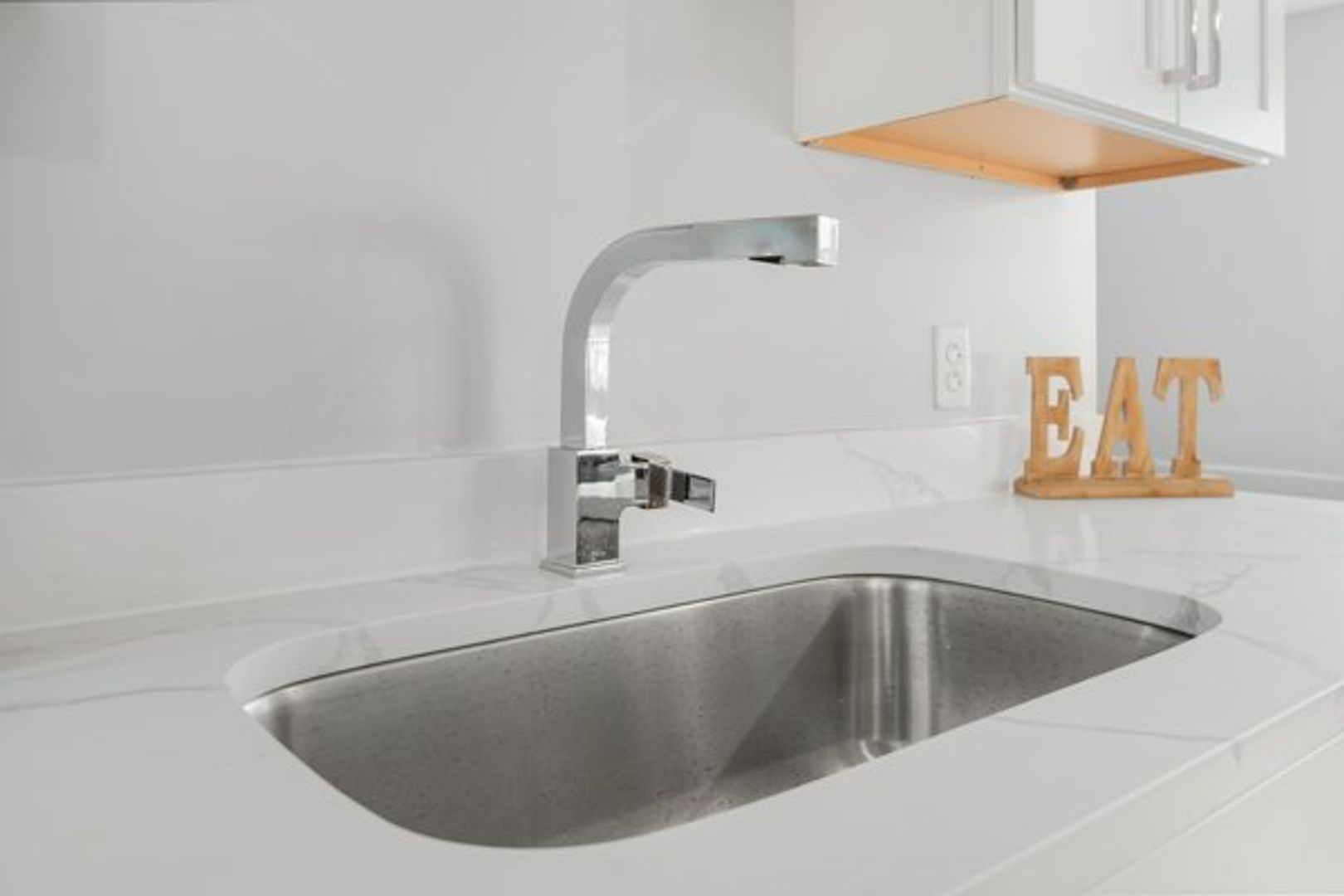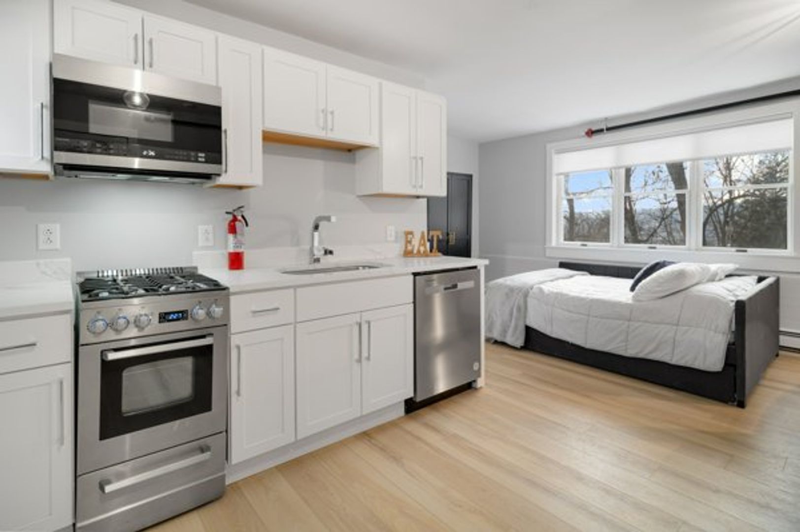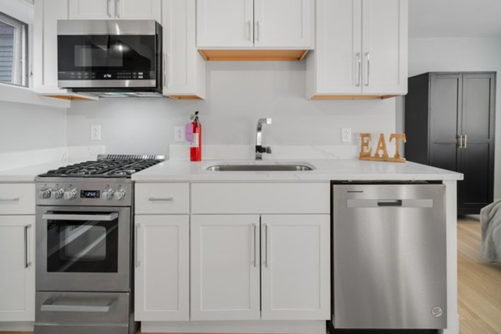 The kitchen features a full suite of new stainless steel appliances (Fridge, Oven/Range, Dishwasher and Microwave), wood cabinets, and brand new, stunning quartz countertops.