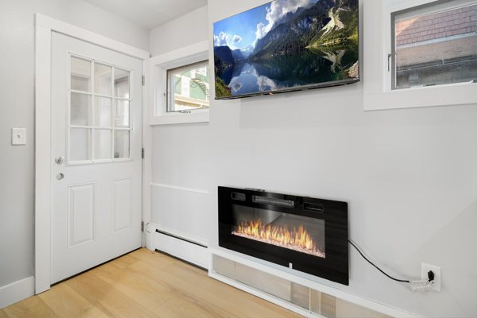 Common area furnishings including wall-mounted flat screen TVs and LED Fireplace. As well as a couch, dining room table with chairs. Also included: full-size bed frame and mattress, desk with chair, and dresser or armoire.